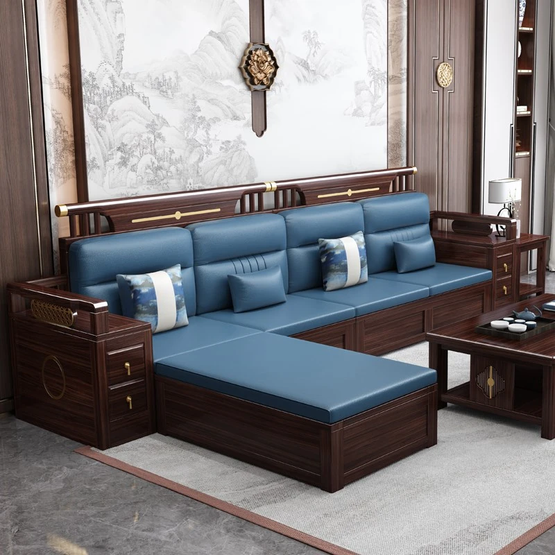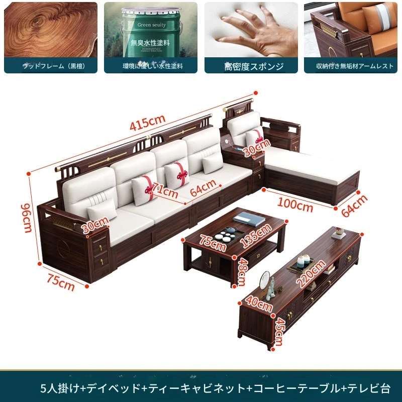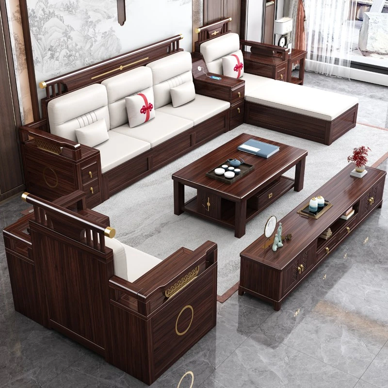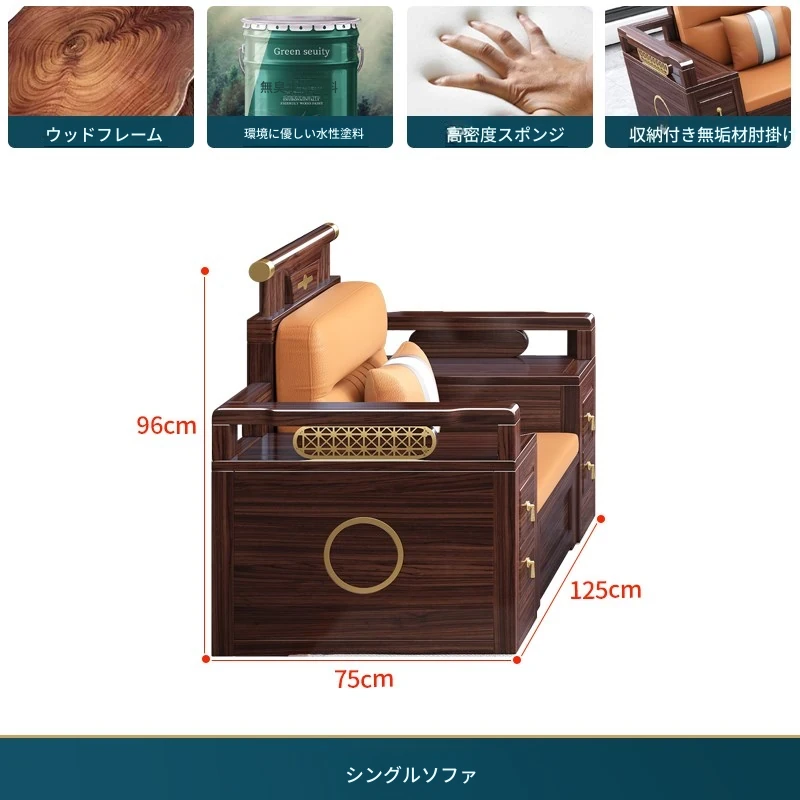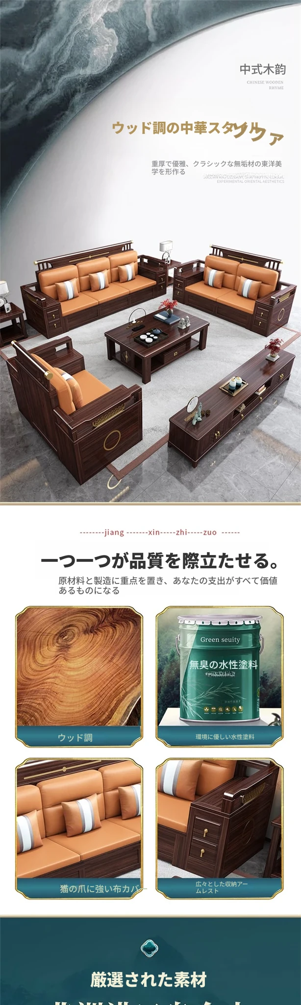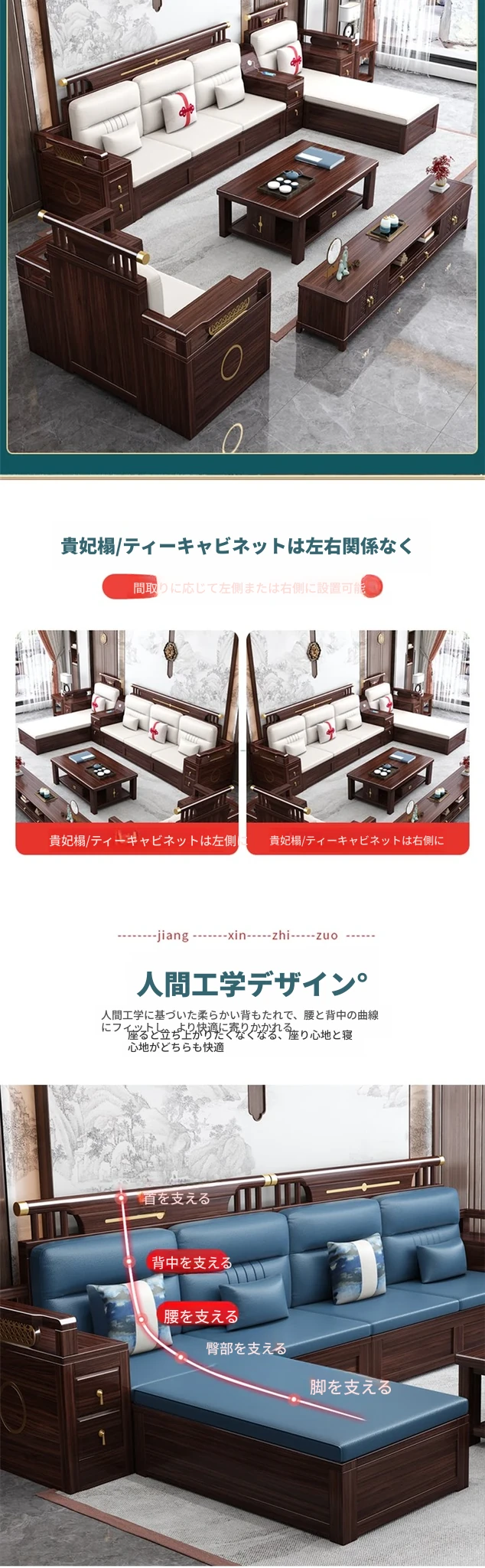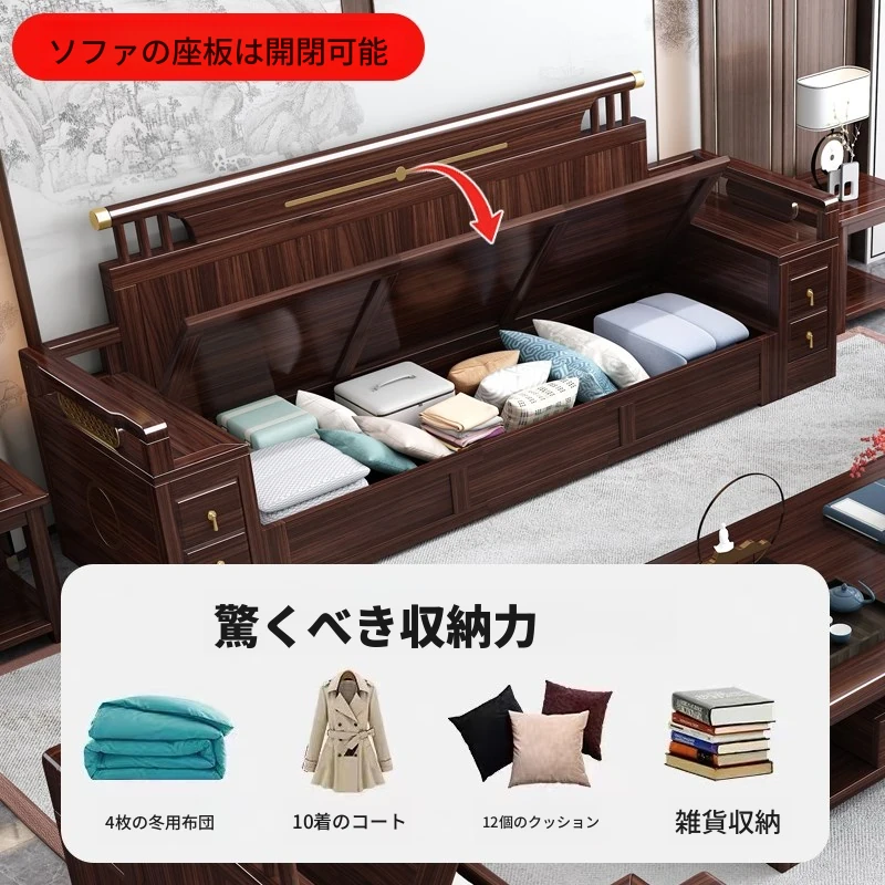 ウッディブラックウッド製の本格派新中式スタイルソファ、高さのある収納付きで冬夏問わず快適な高品質ラグジュアリーリビング家具セット。あなたのリビングを格上げする一品です!