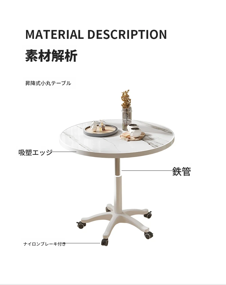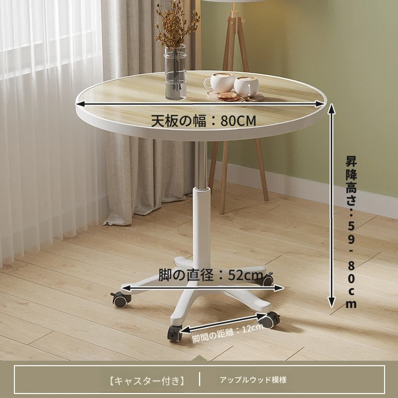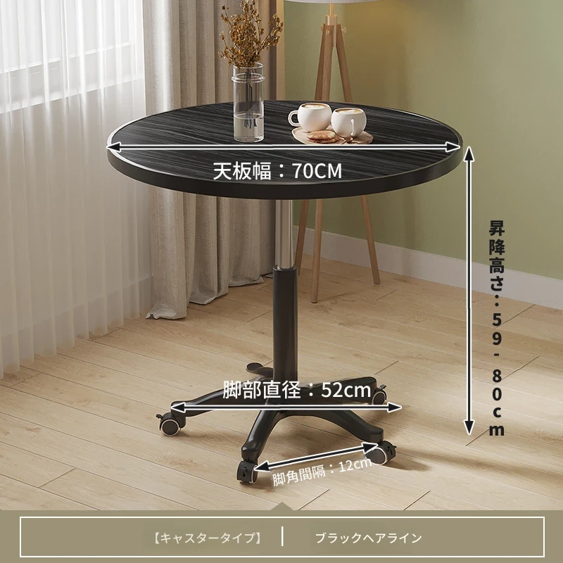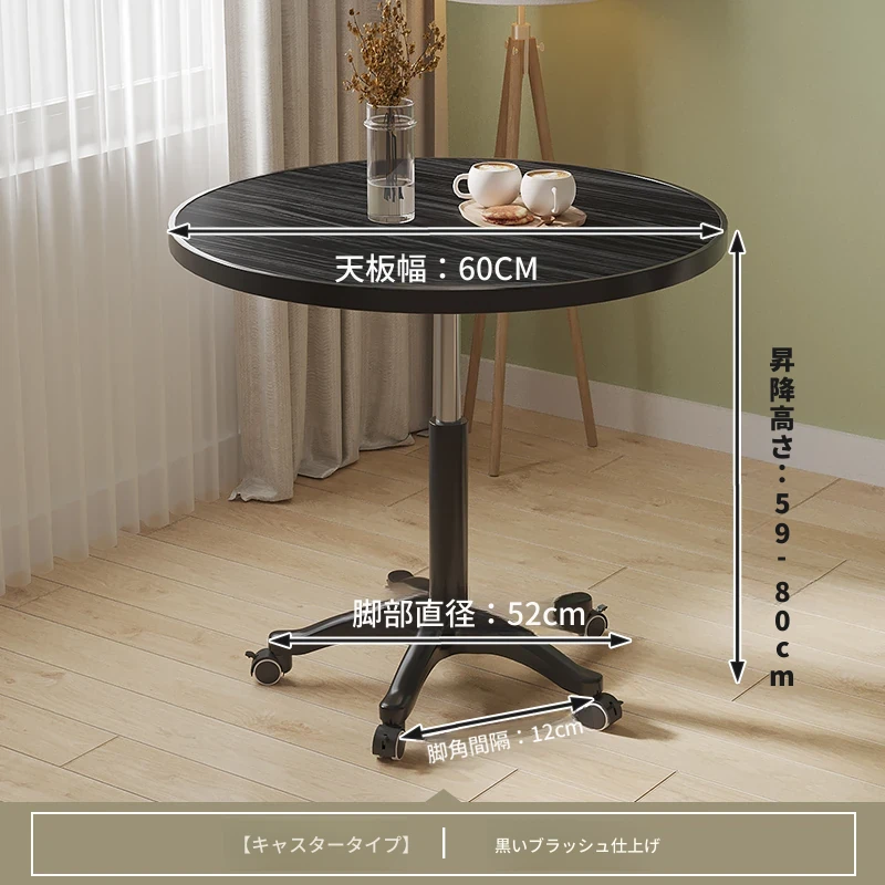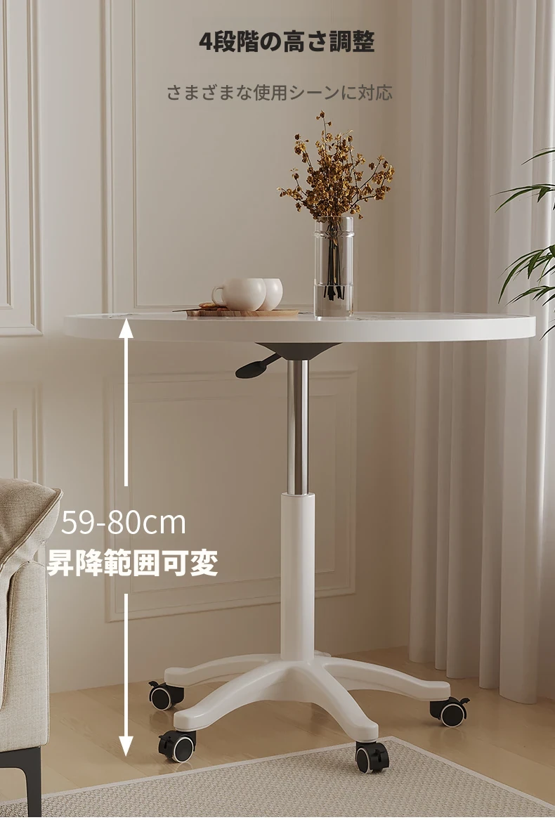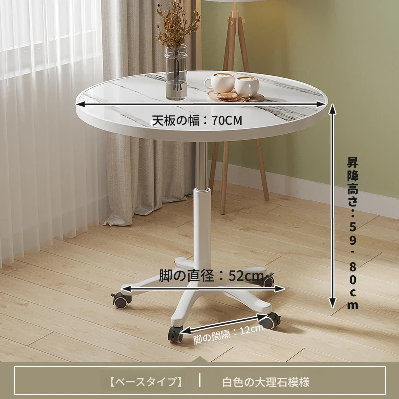 シンプルな家庭用バルコニー用昇降式小丸テーブル - キャスター付きで移動もラクラク!接客や打ち合わせ、おしゃれなソファサイドやベッドサイドのリラックススペースに最適な一品です。