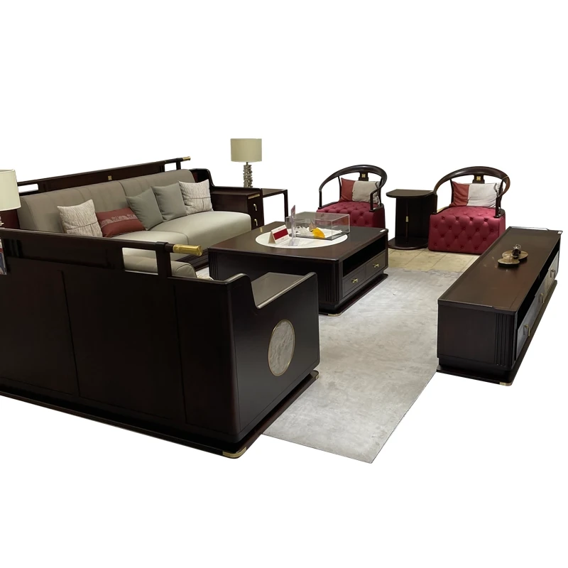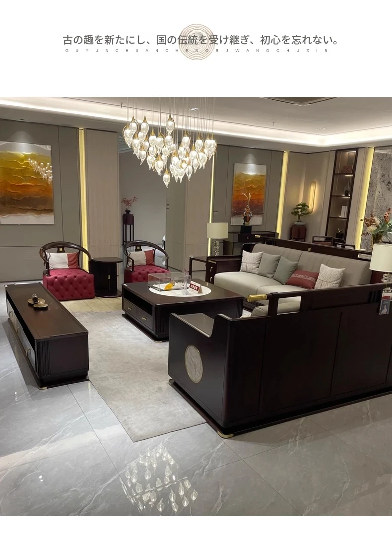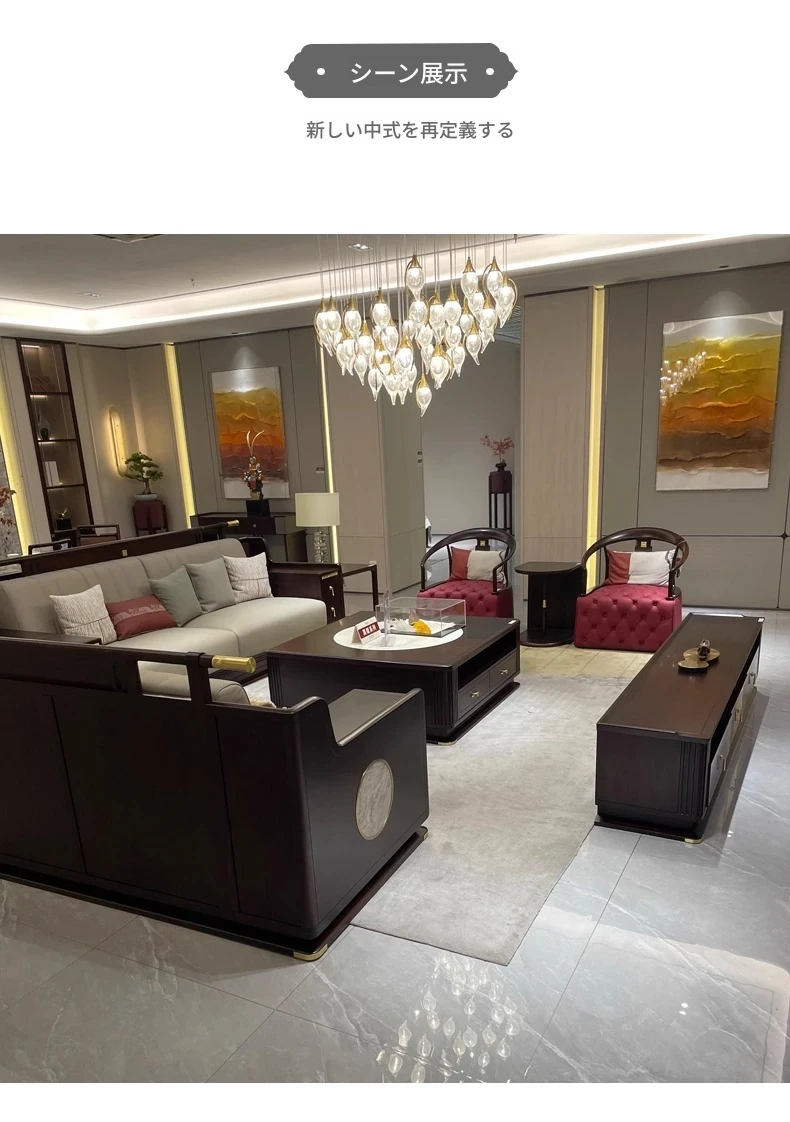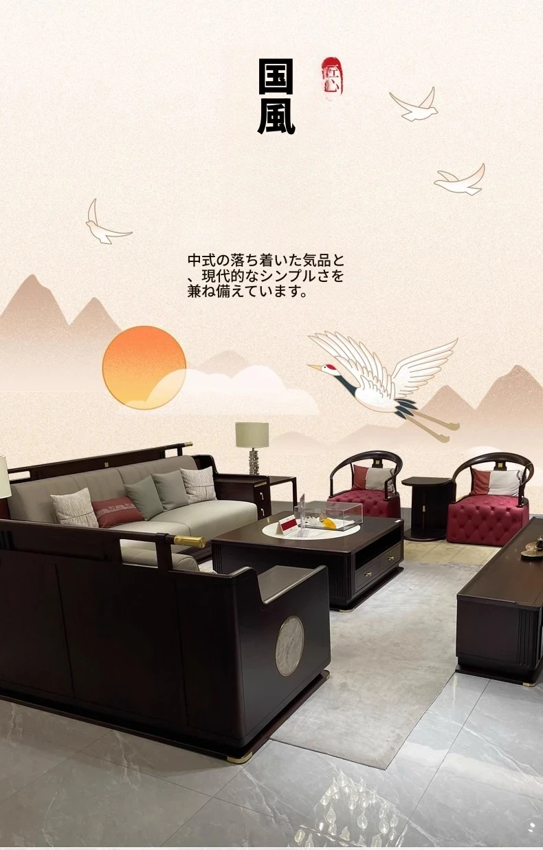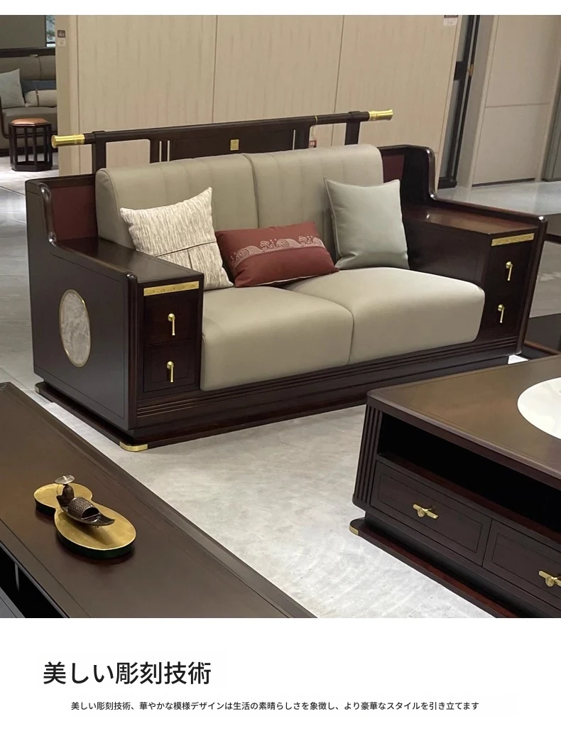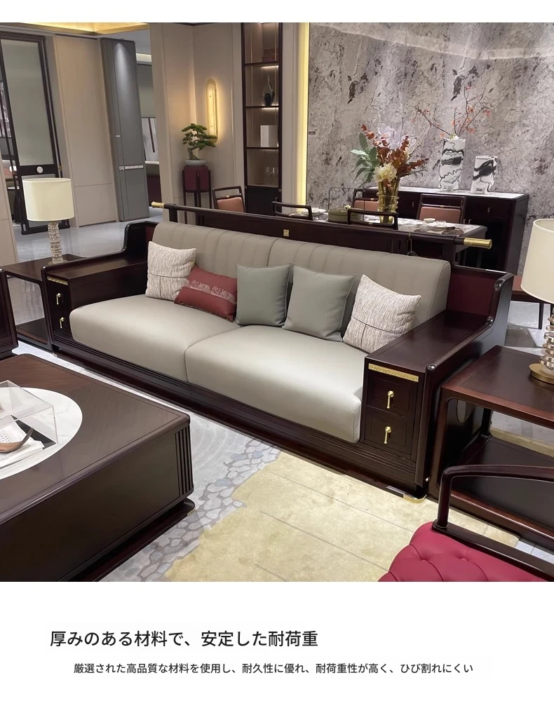 新中式ウッドソファセット - ウッ金木使用、モダンでシンプルなデザイン、広々としたリビングに最適な中国風禅スタイル家具。高級感溢れる空間を演出し、心安らぐひとときを提供します!