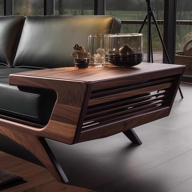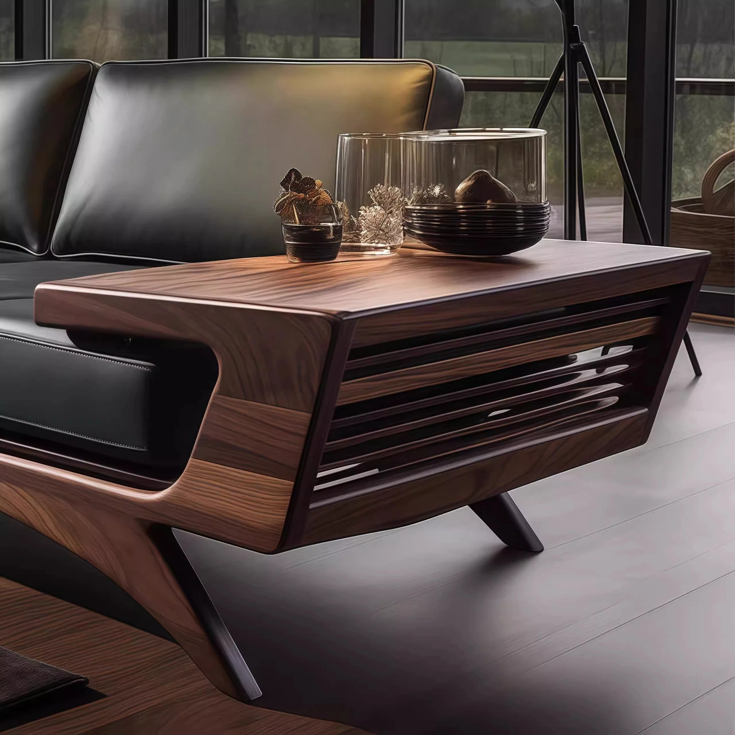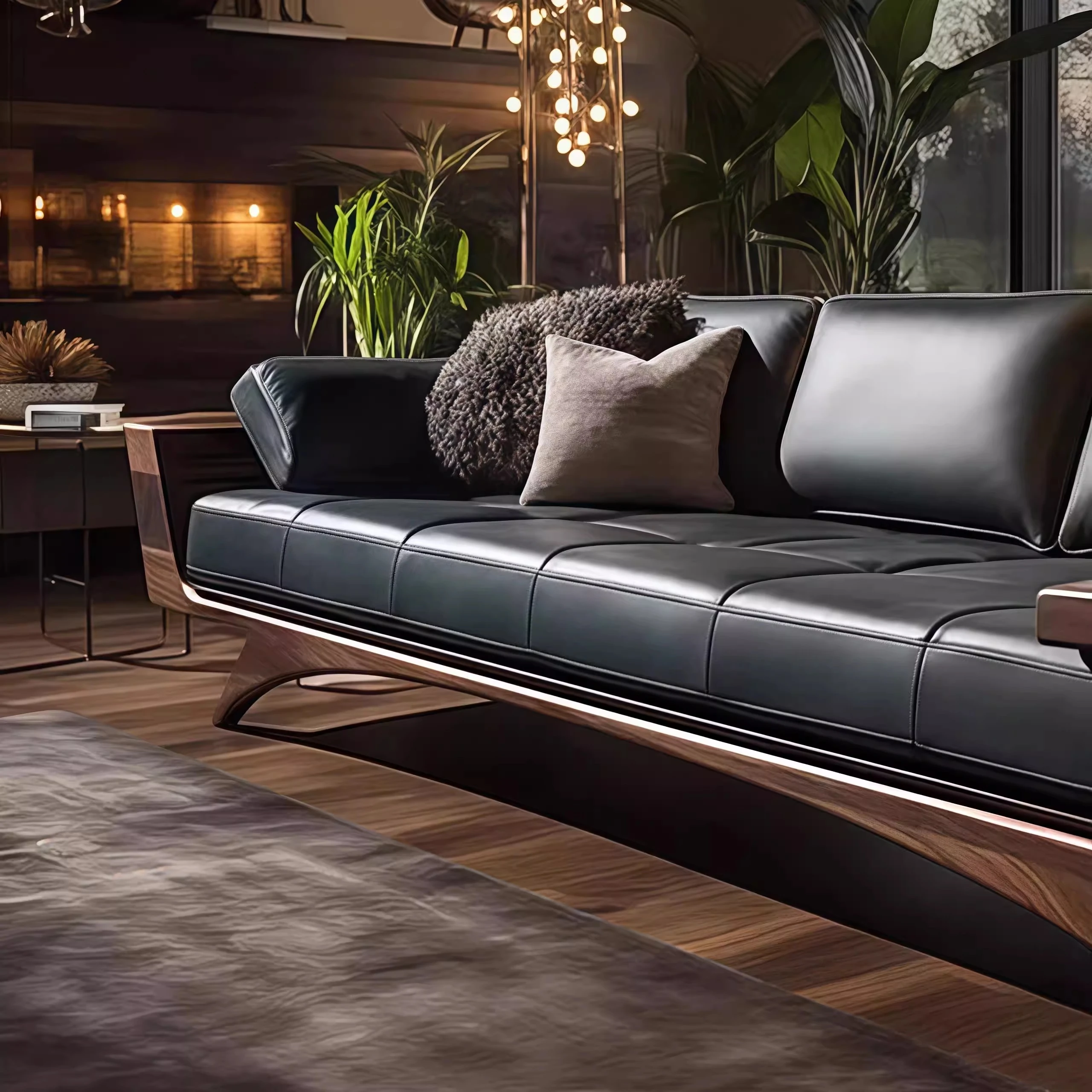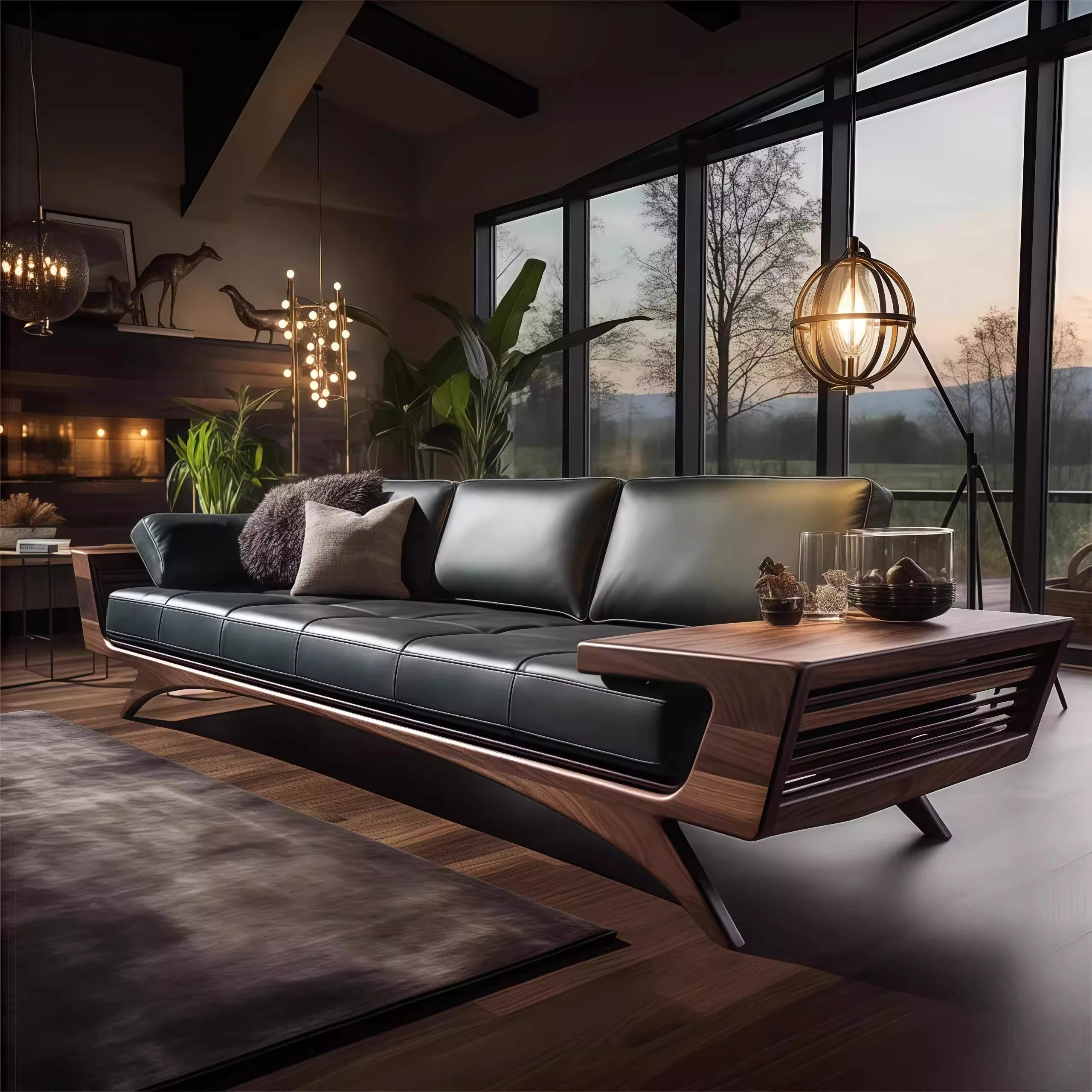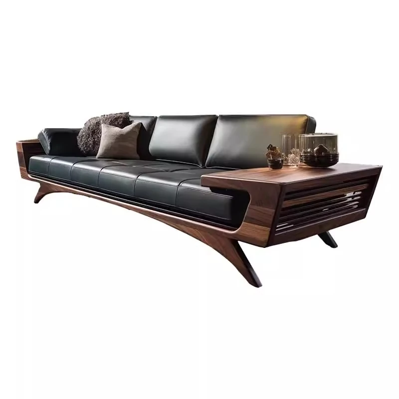 新中式ウォールナット無垢材ソファ - モダンイタリアンスタイルのリビングにぴったり!シンプルで高級感溢れるデザイン、ヴィラにも最適な直置きタイプ。上質なレザー仕上げで、贅沢なひとときをお楽しみください。