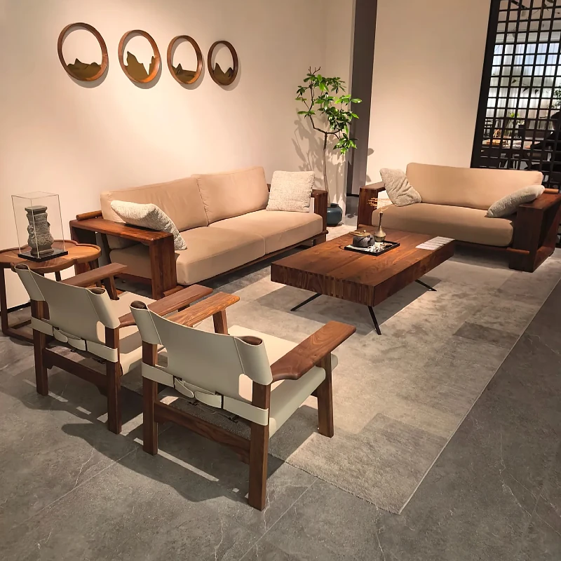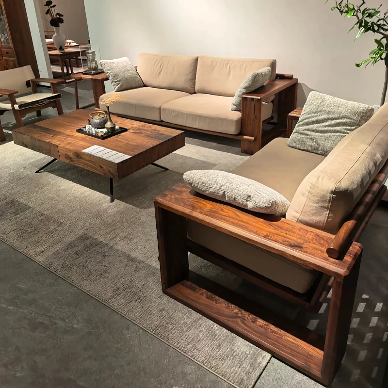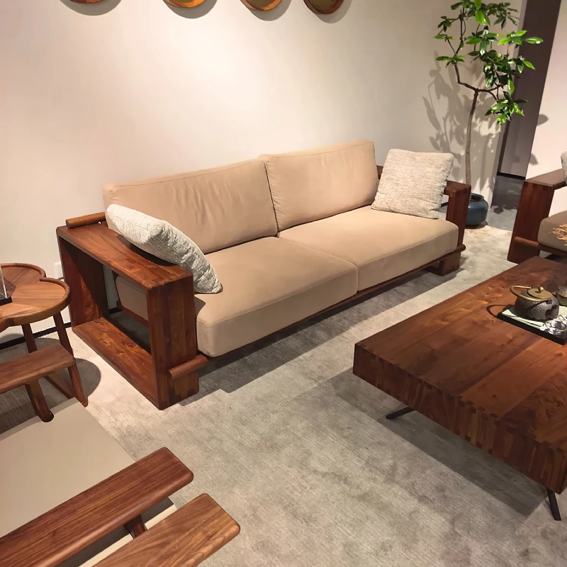 新中式スタイルの無垢材ソファセット - 現代的なシンプルさと宋氏美学を融合したブラックウォールナット製ファブリック中国風直線ソファ。優雅なデザインで、あなたのリビングに洗練された雰囲気をプラスします!