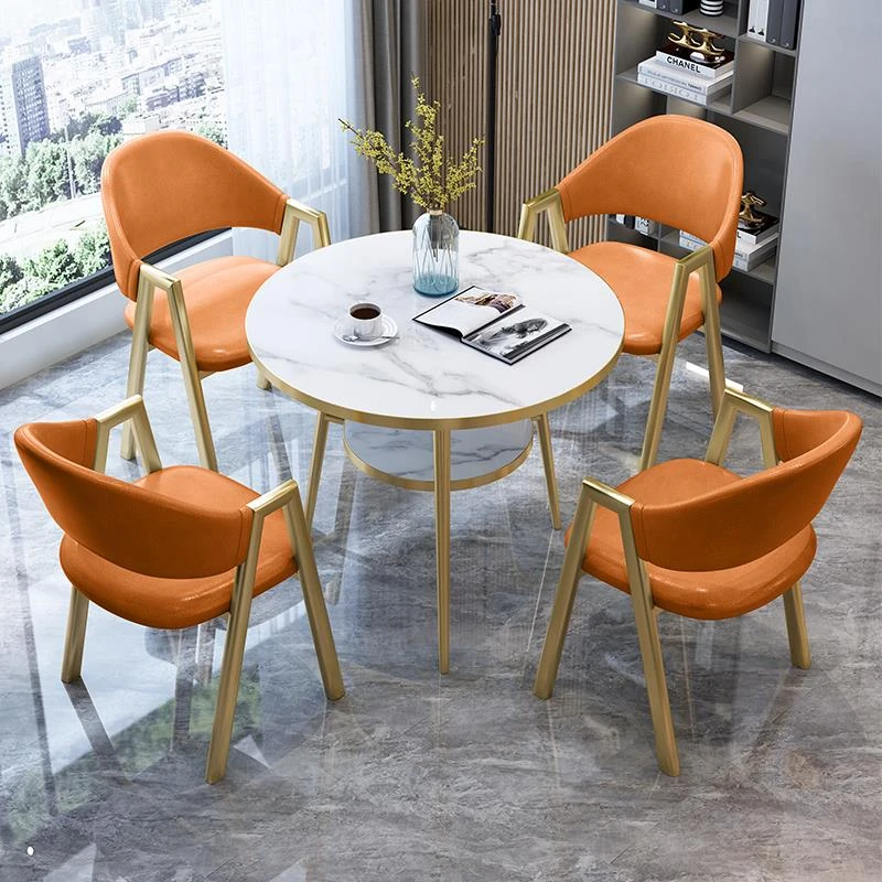 (80擬似大理石円卓+4皮椅子)オレンジ