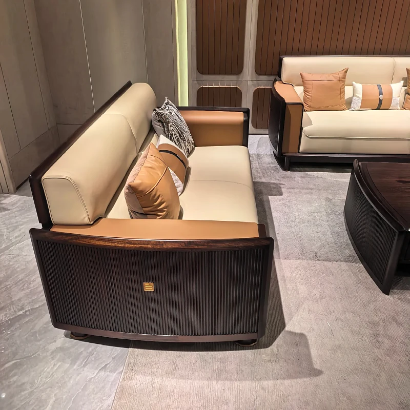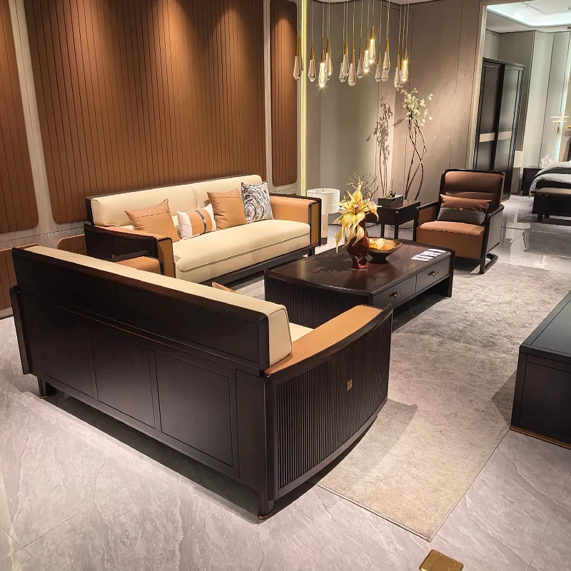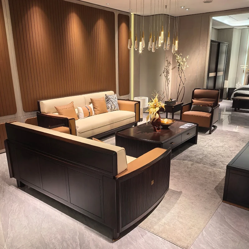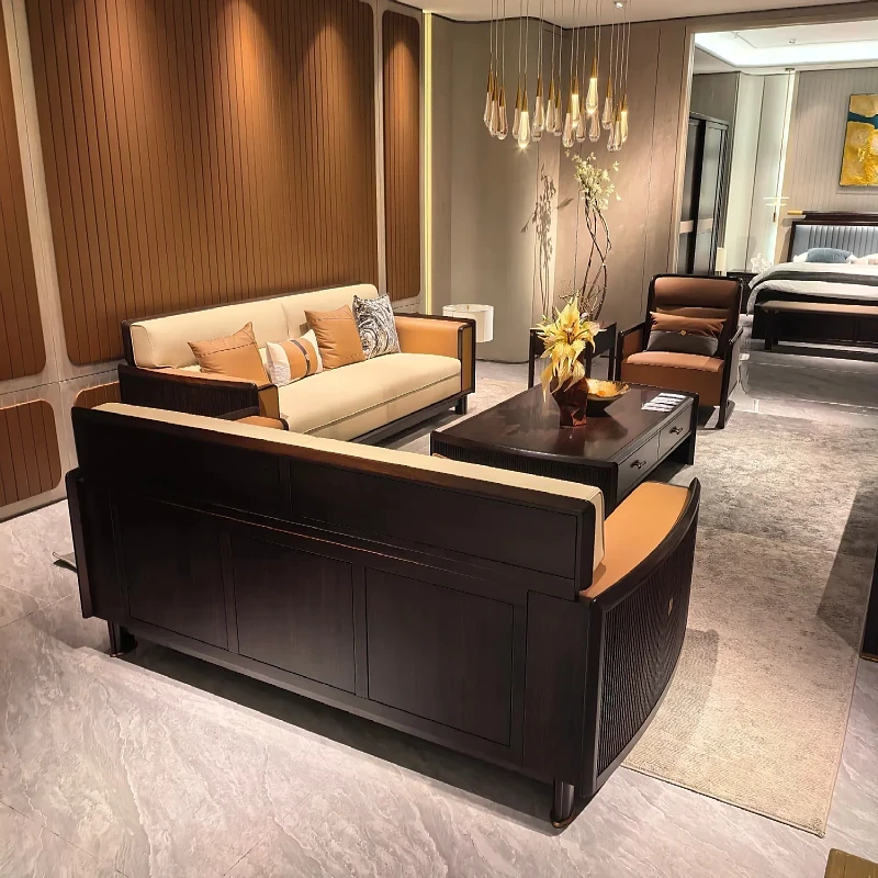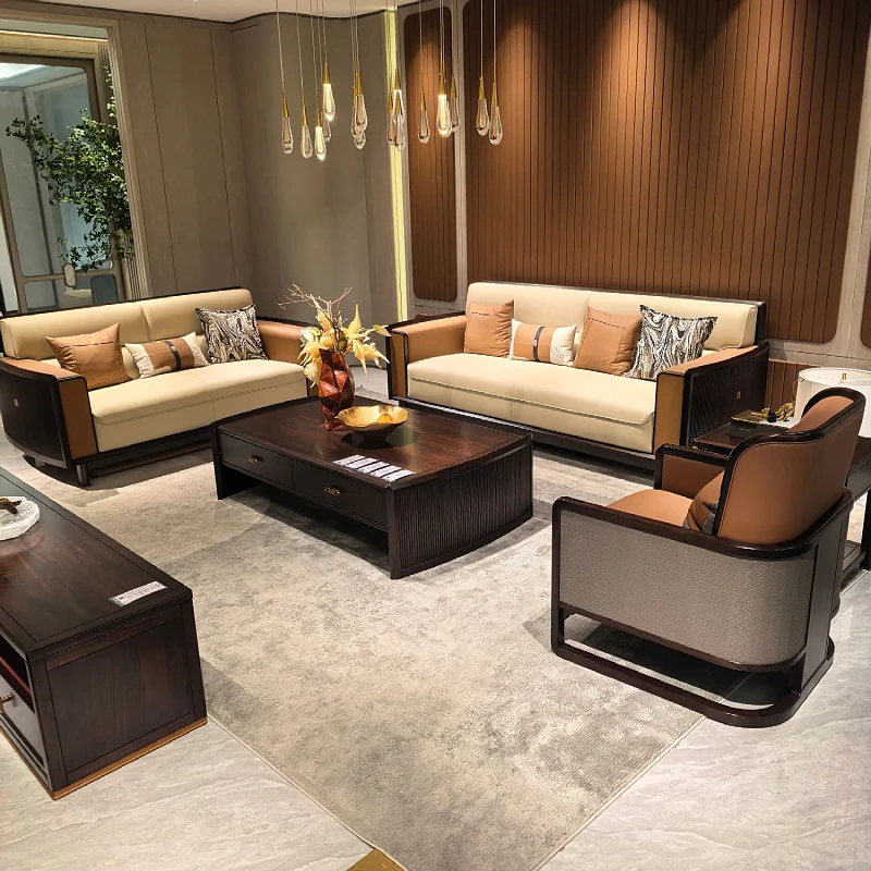 新中式ウッドウッドソファセット - モダンでシンプルなデザイン、別荘や大小のリビングに最適!高級レザー使用、快適さとスタイルを両立。新しいスタイルの生活空間を演出します!