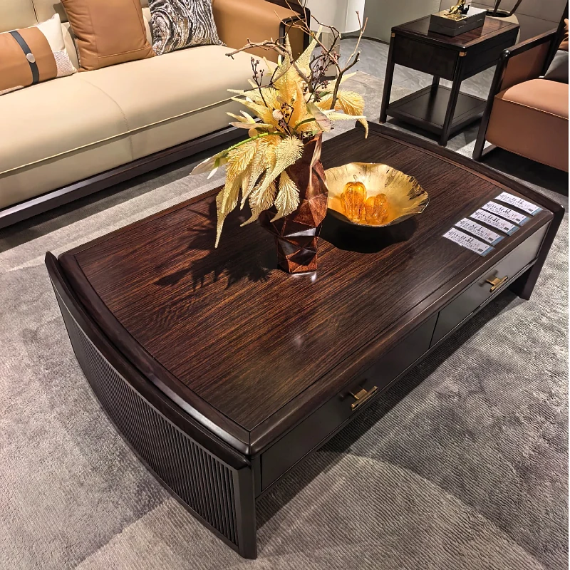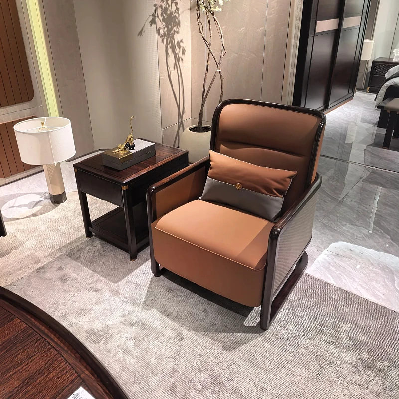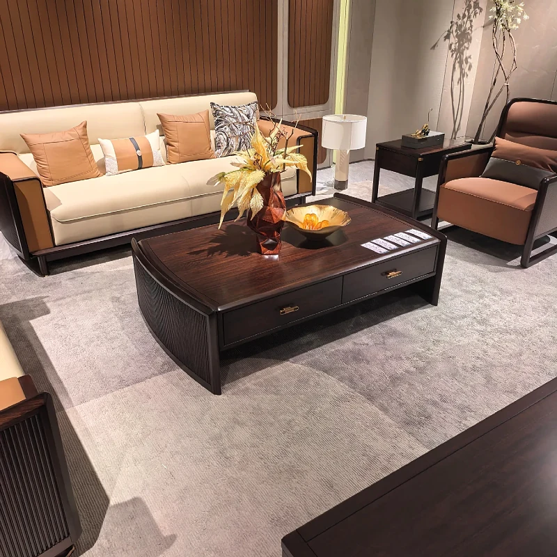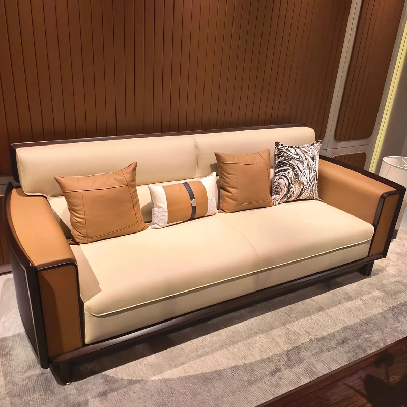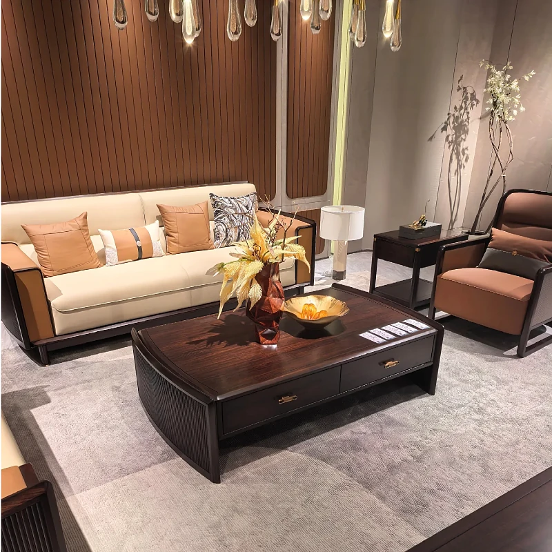 新中式ウッドウッドソファセット - モダンでシンプルなデザイン、別荘や大小のリビングに最適!高級レザー使用、快適さとスタイルを両立。新しいスタイルの生活空間を演出します!