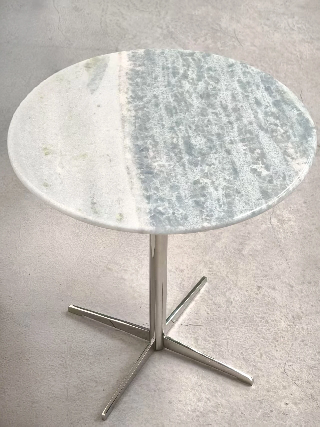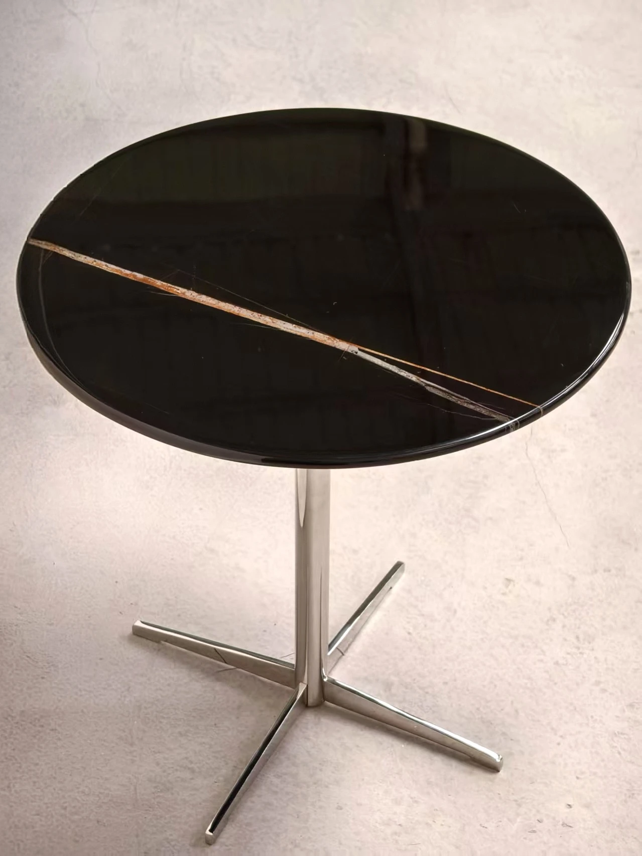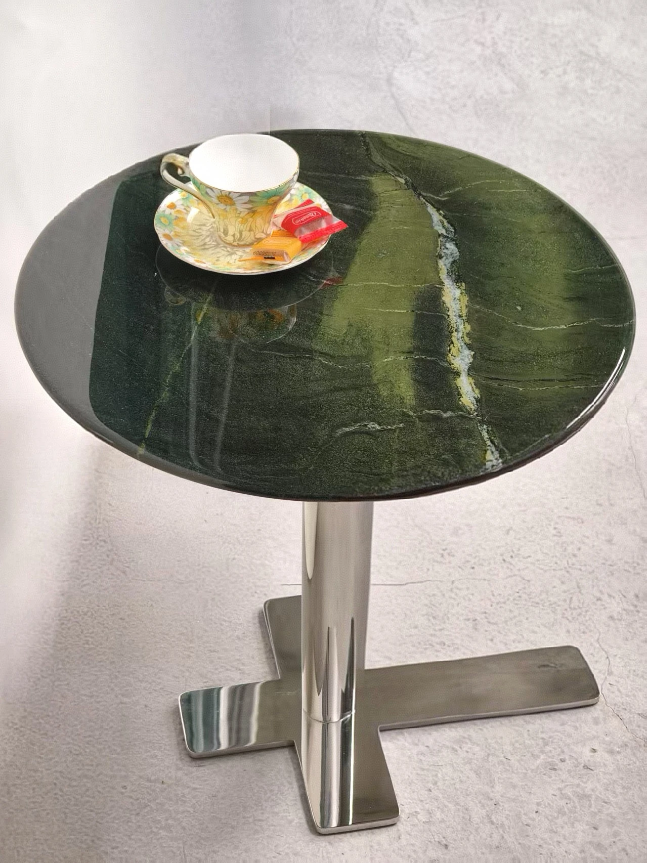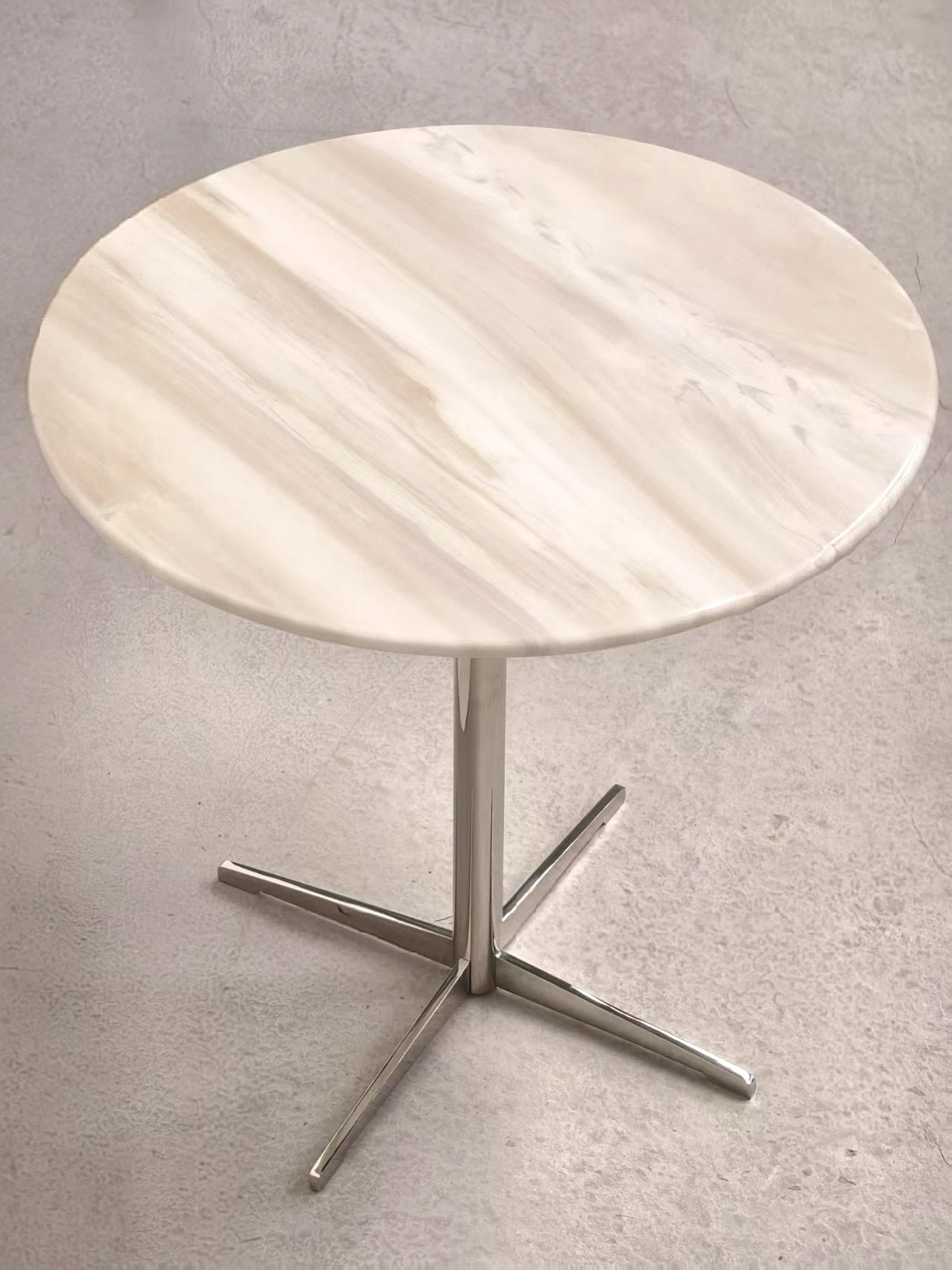 北欧デザインのクロス脚ステンレス大理石製小型ラウンドテーブル - モデルルームやリビングに最適な、スタイリッシュなカフェテーブル!おしゃれな談話スペースを演出します。