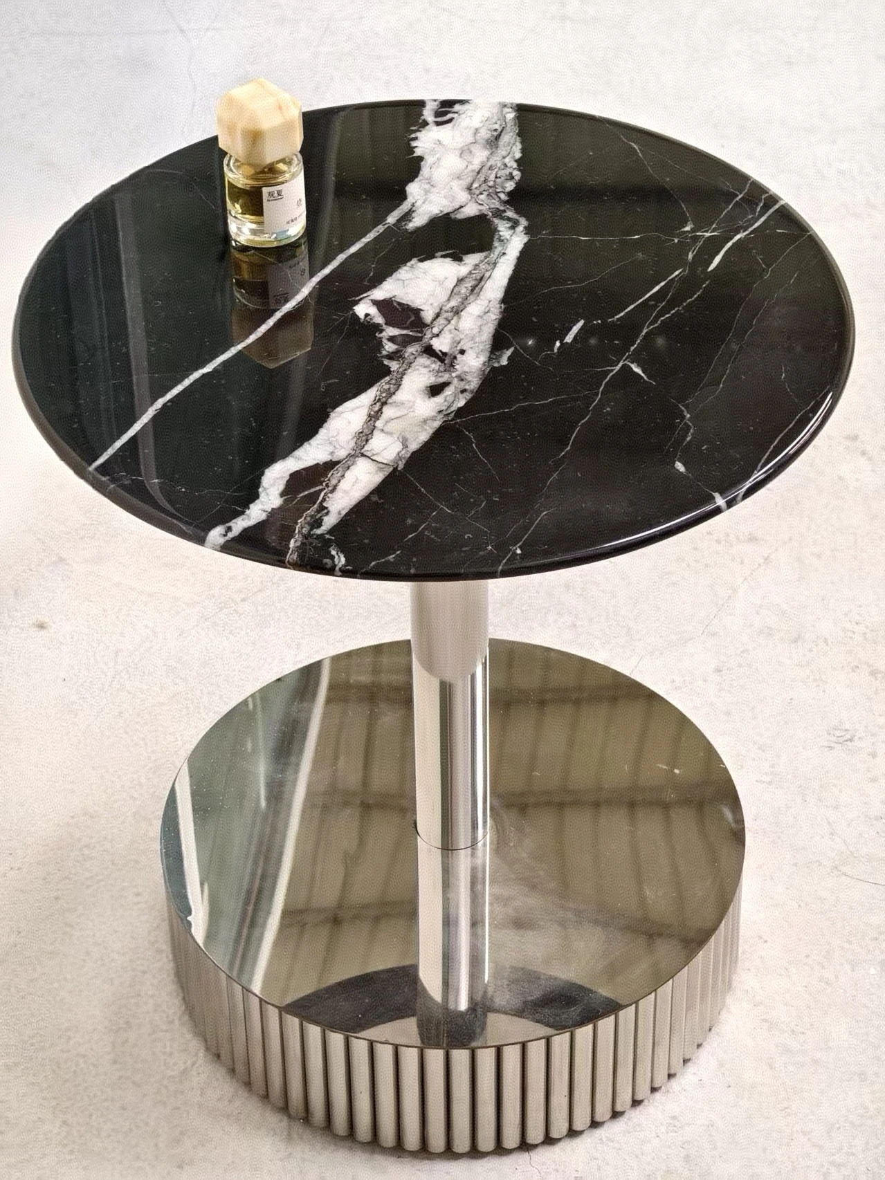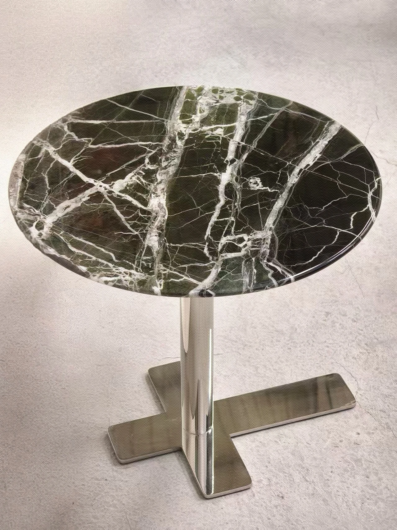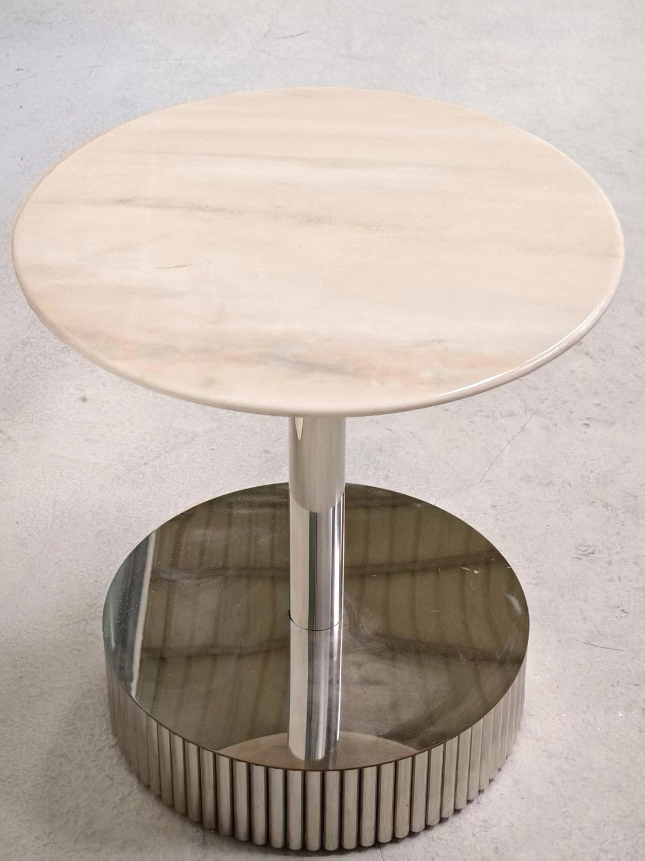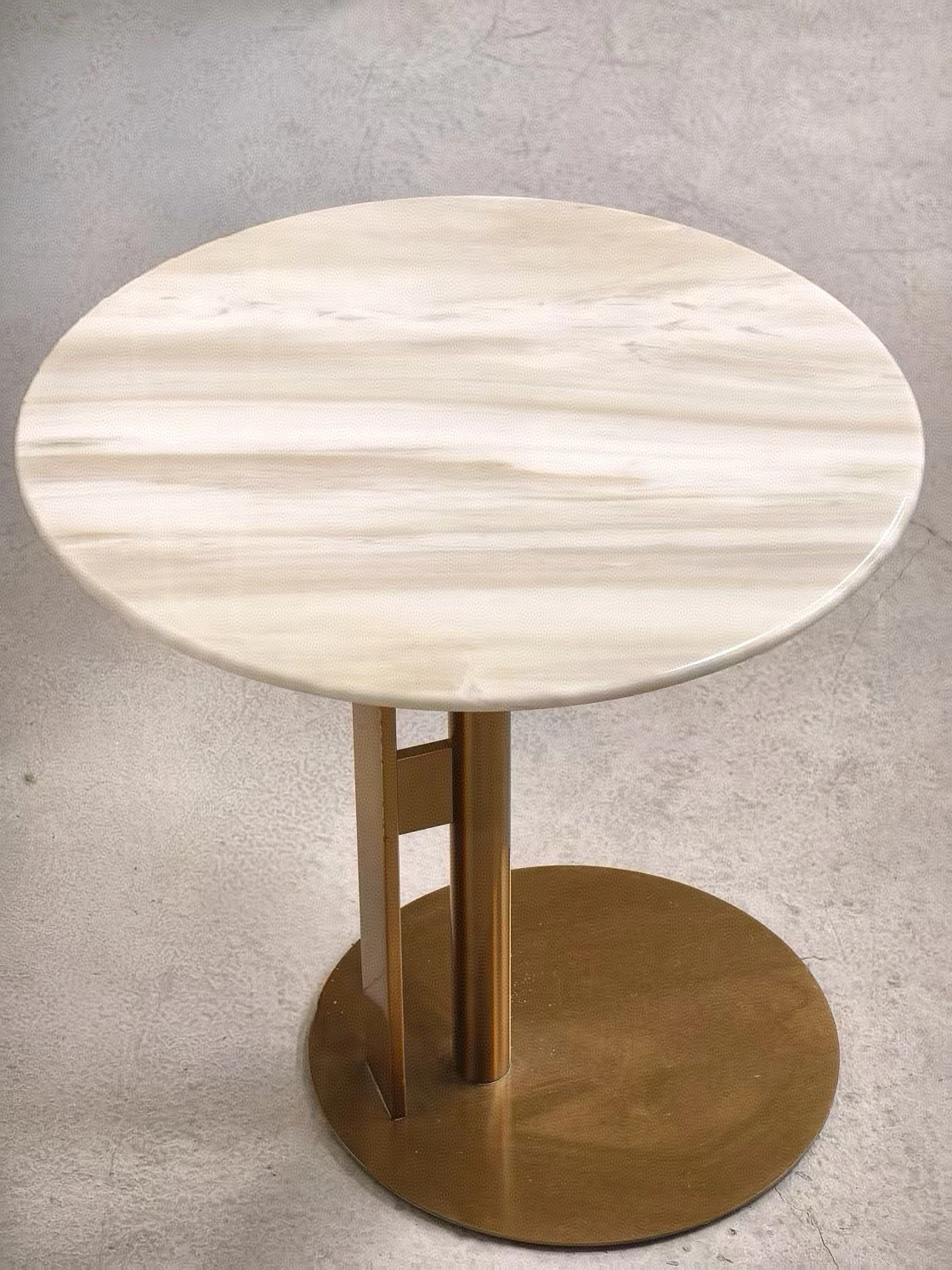 北欧デザインのクロス脚ステンレス大理石製小型ラウンドテーブル - モデルルームやリビングに最適な、スタイリッシュなカフェテーブル!おしゃれな談話スペースを演出します。