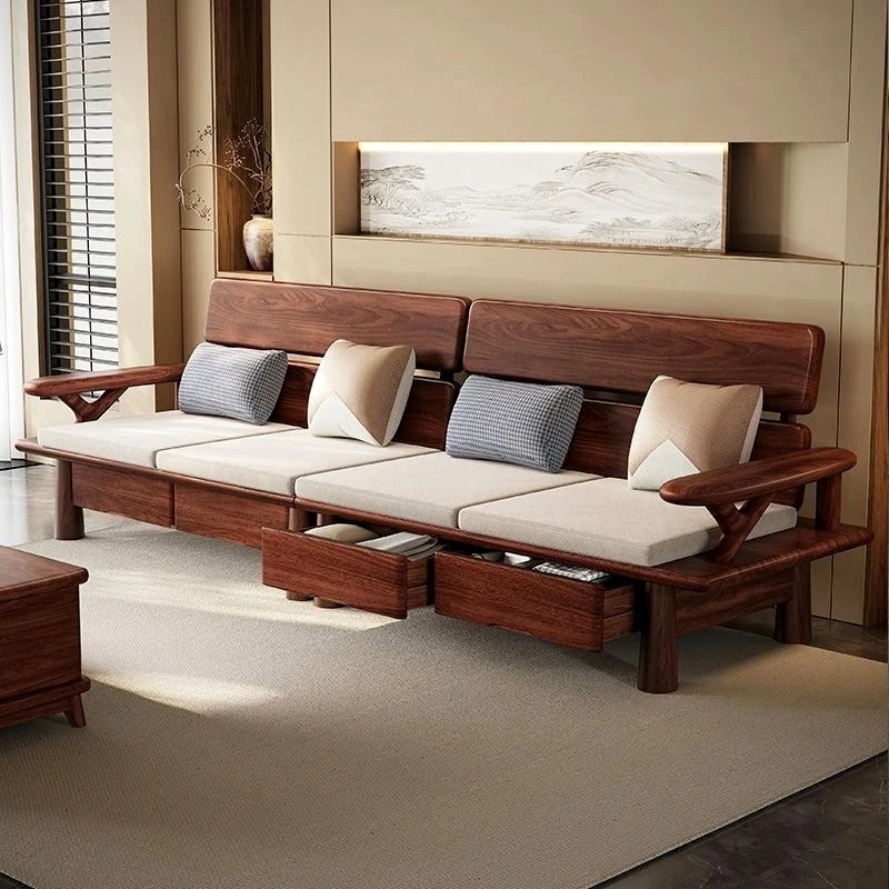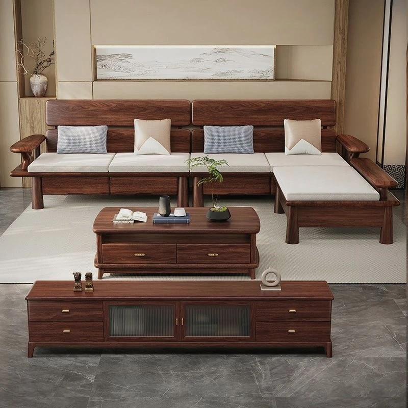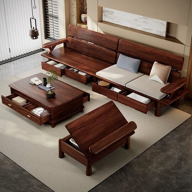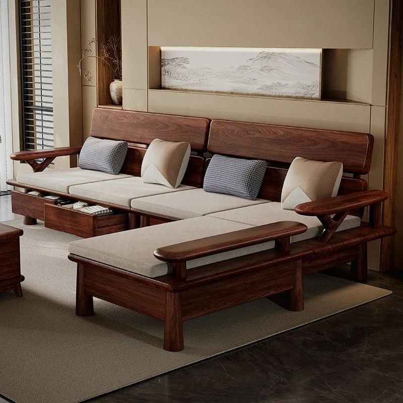 ウォールナット無垢材使用!モダンなU字型レトロソファ - 小型・中型リビングに最適、多機能ストレージ付きで家族みんなが快適に過ごせる空間を演出!