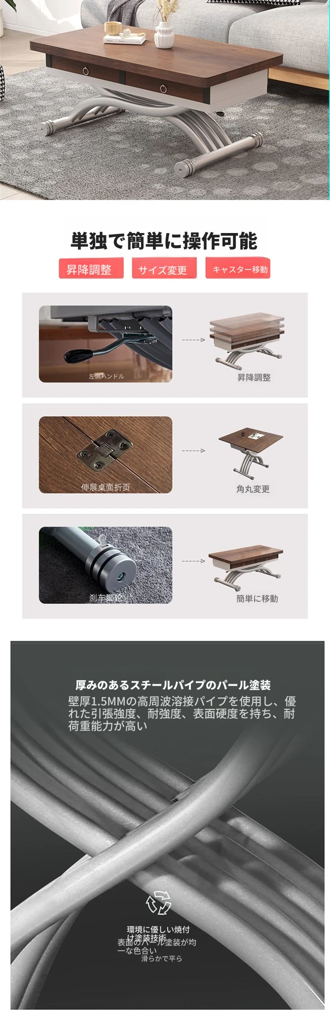 90*45【ドリームカラー+2引き出し】昇降式コーヒーテーブルダイニングテーブル /ゼロホルムアルデヒドオスモーズ