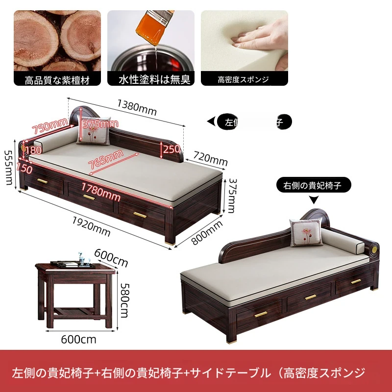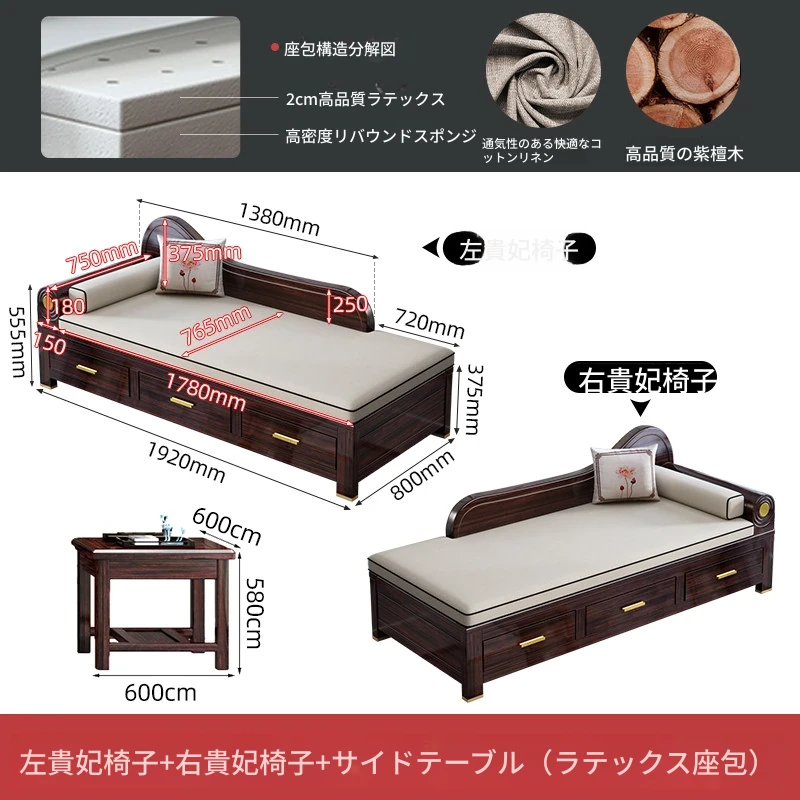 [紫金檀木]左貴妃ソファ+右貴妃ソファ+サイドテーブル(高密度スポンジ)