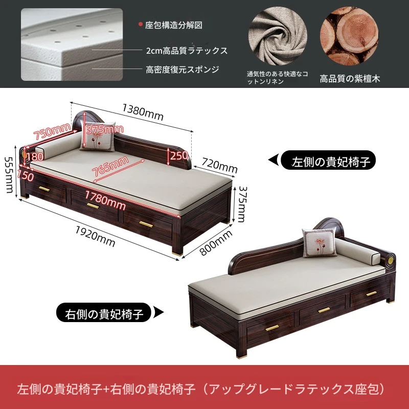 [紫金檀木]左貴妃ソファ+右貴妃ソファ(アップグレードラテックスシートパック)