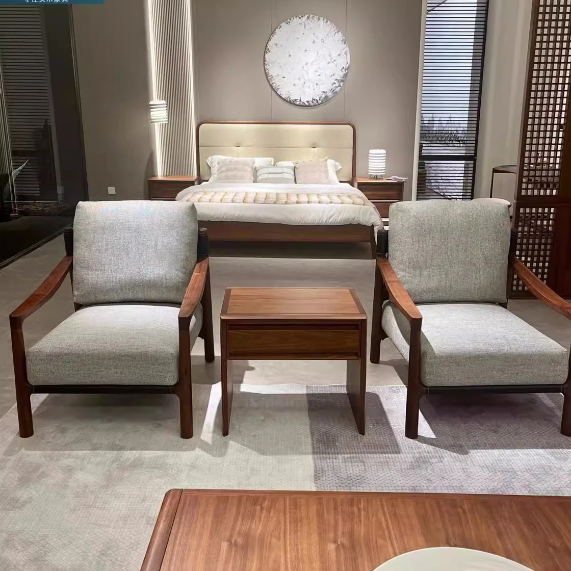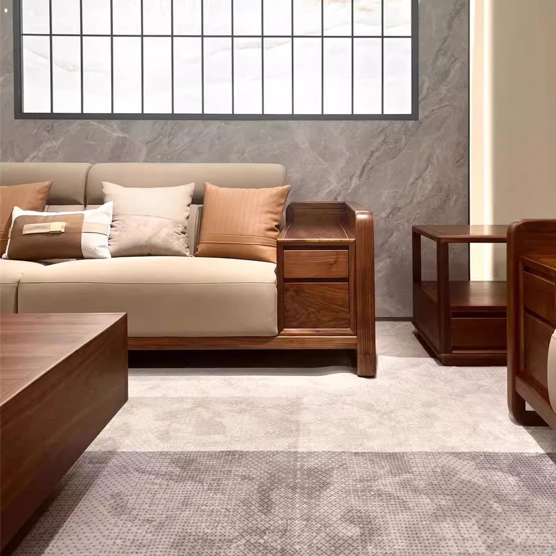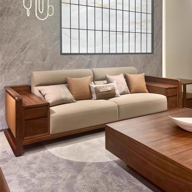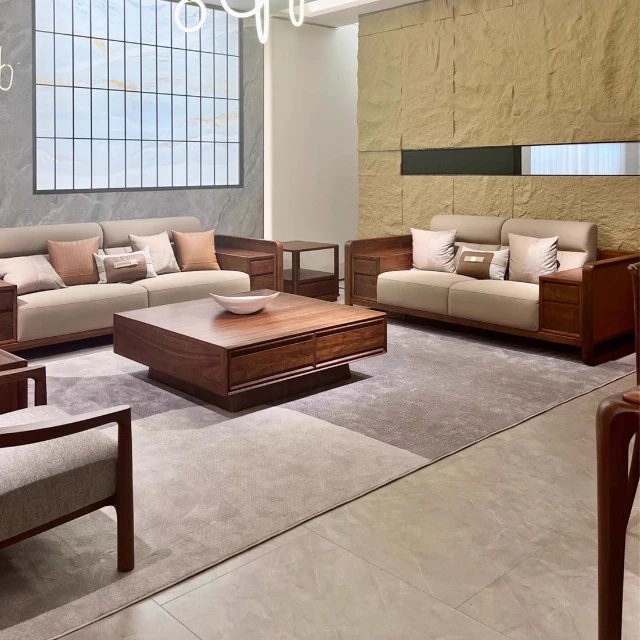 新中式デザインの北米産ブラックウォルナット無垢材ソファセット - 高級感あふれる広々とした別荘のリビングにぴったりなファブリックソファ!