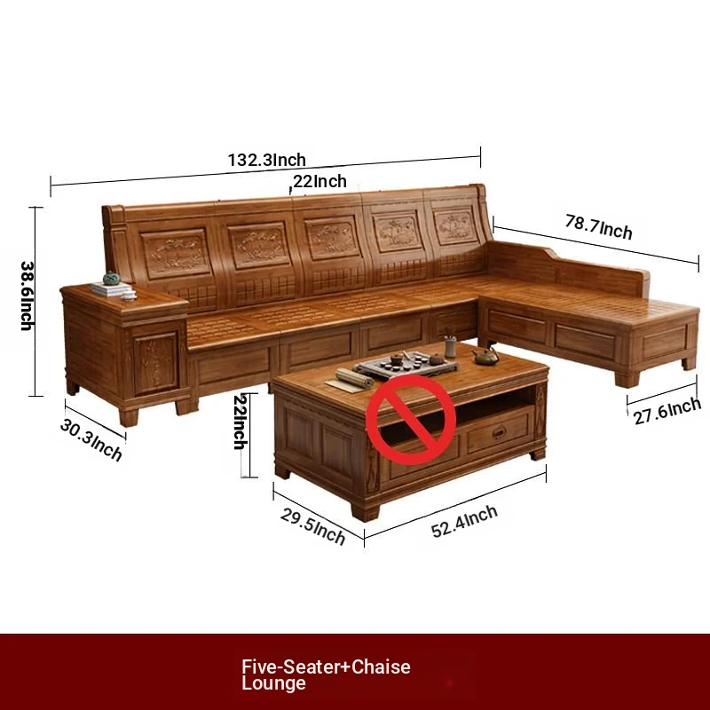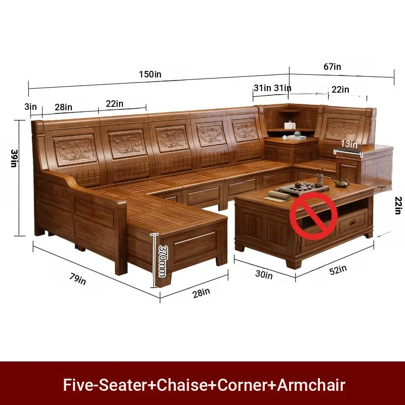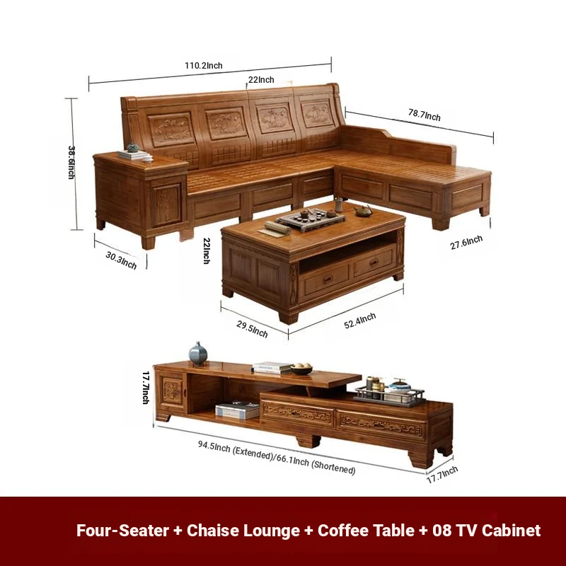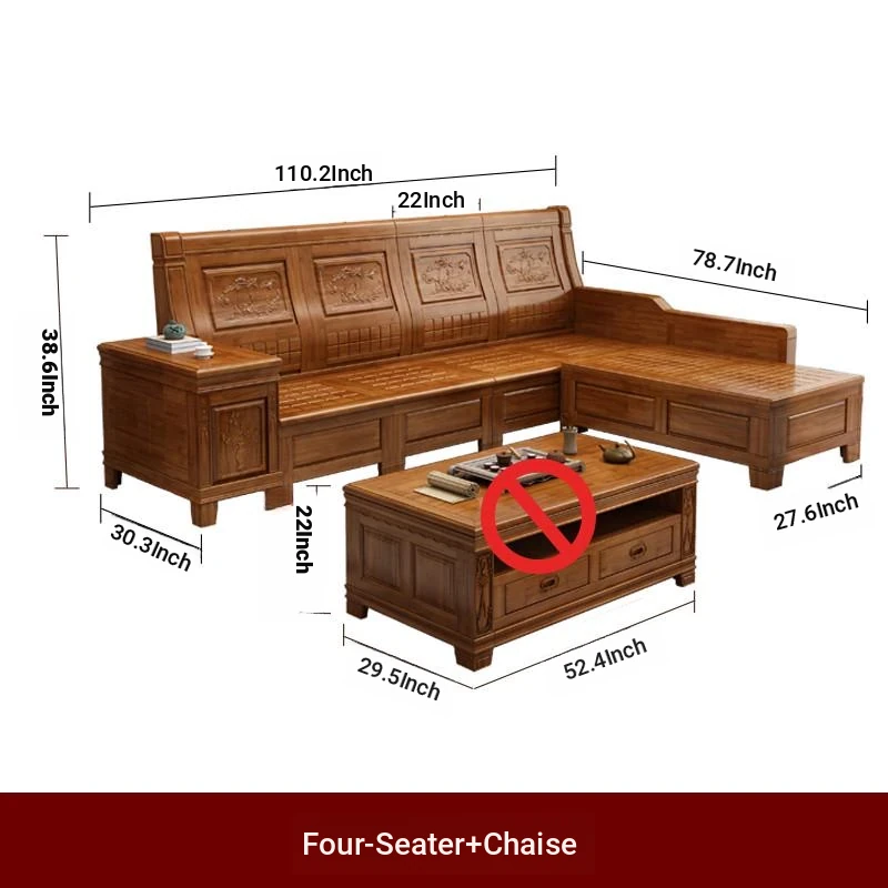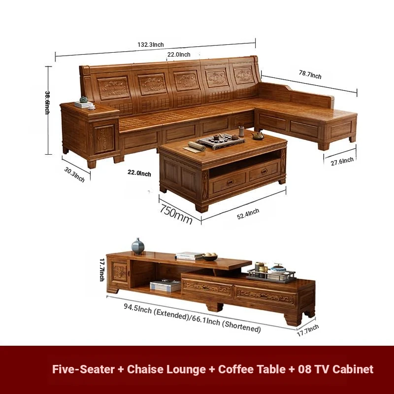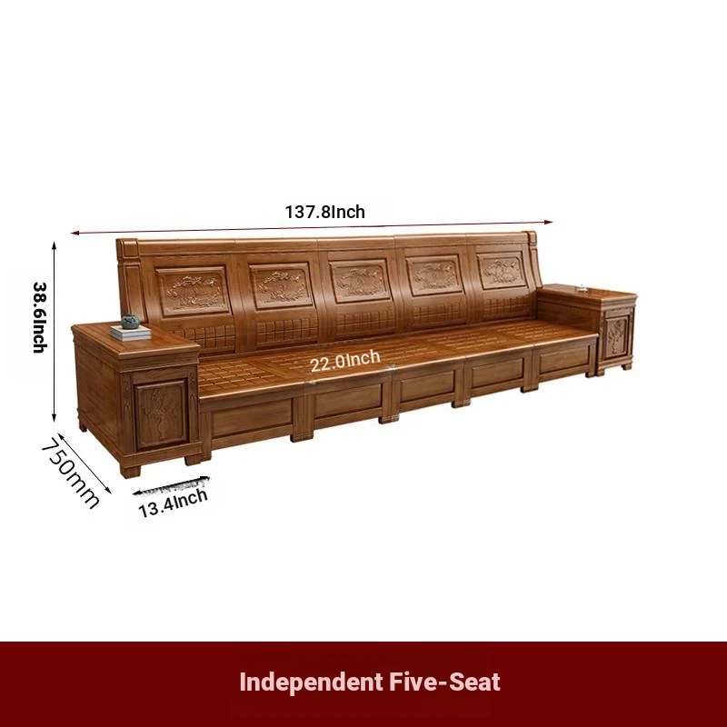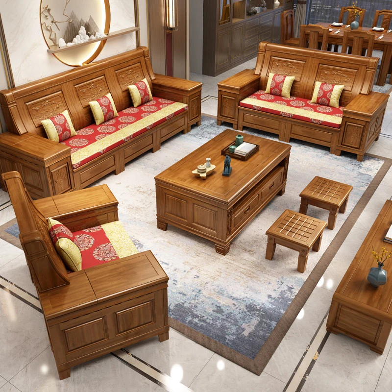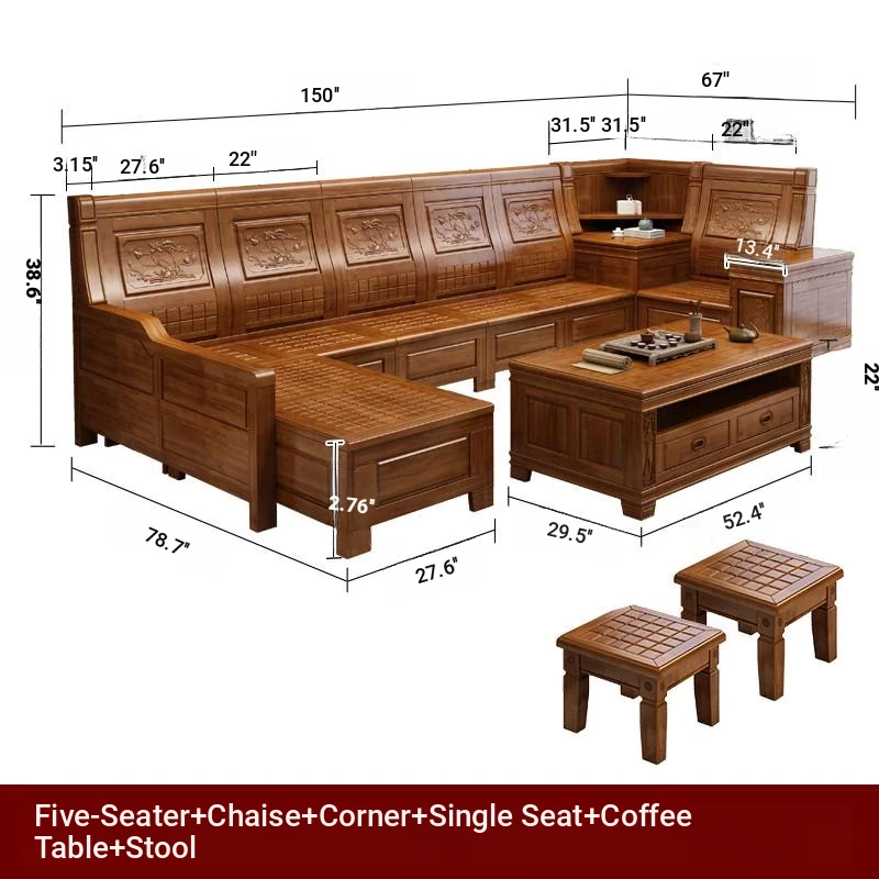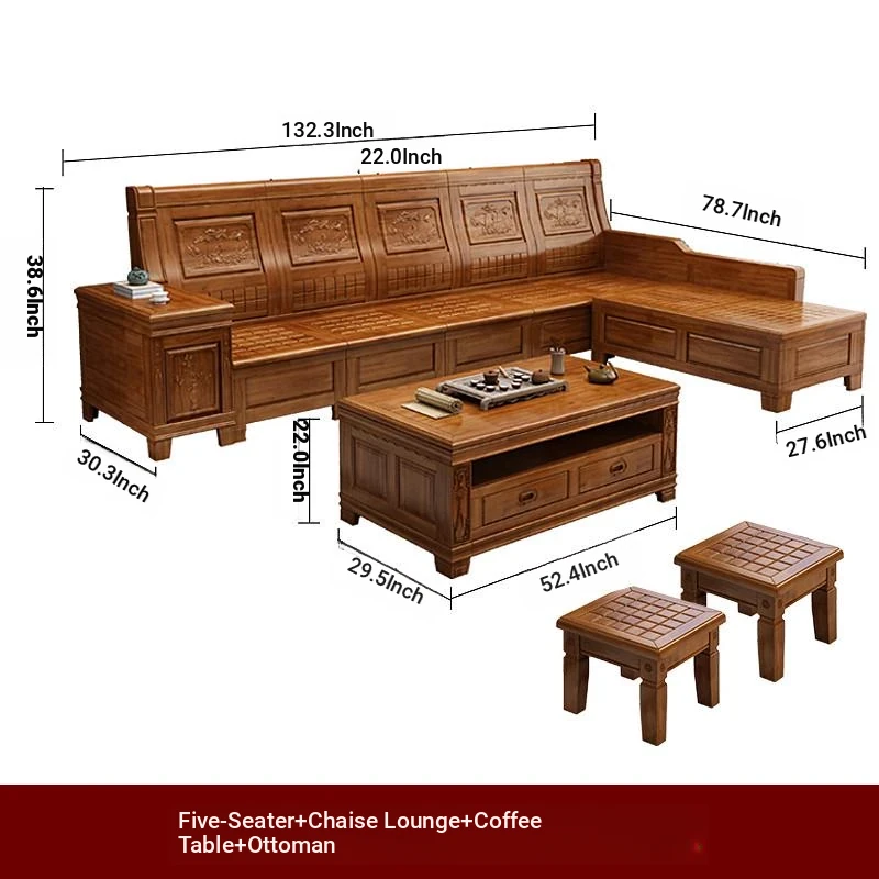 Stylish Solid Zhangzhu Wood Sofa Set - Full Solid Wood Corner Sofa with Elegant Carvings, Chinese-Style Living Room Furniture with Storage Solutions