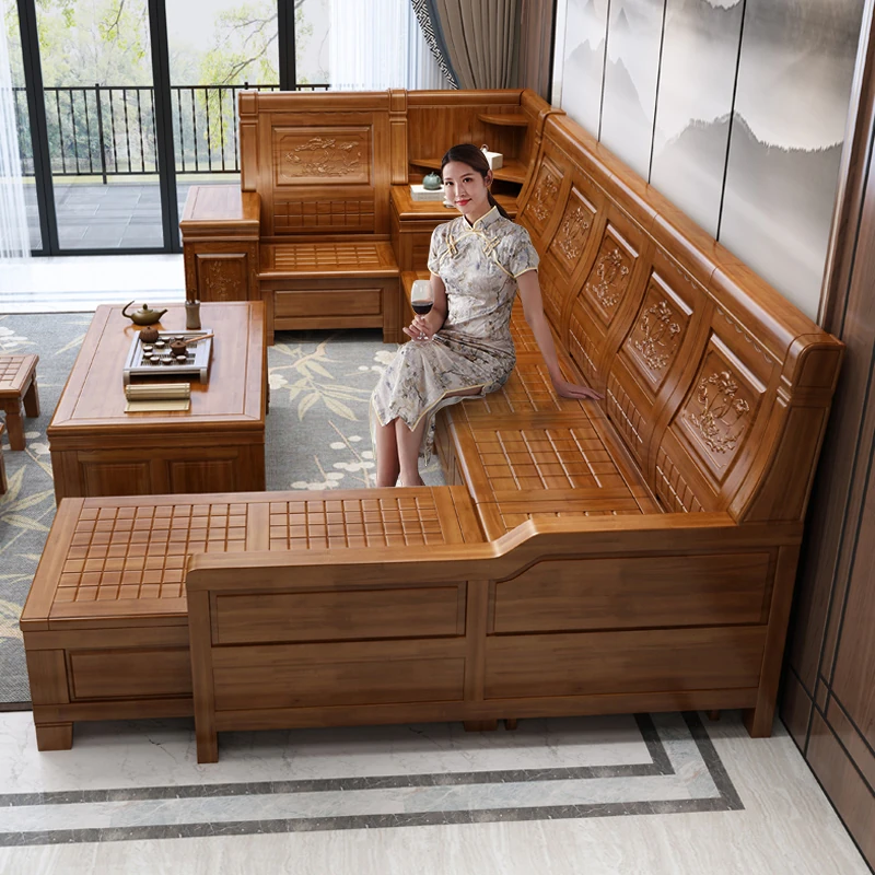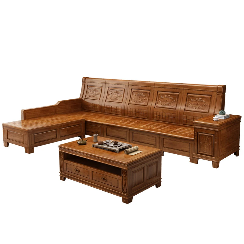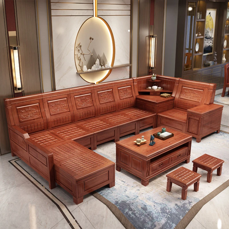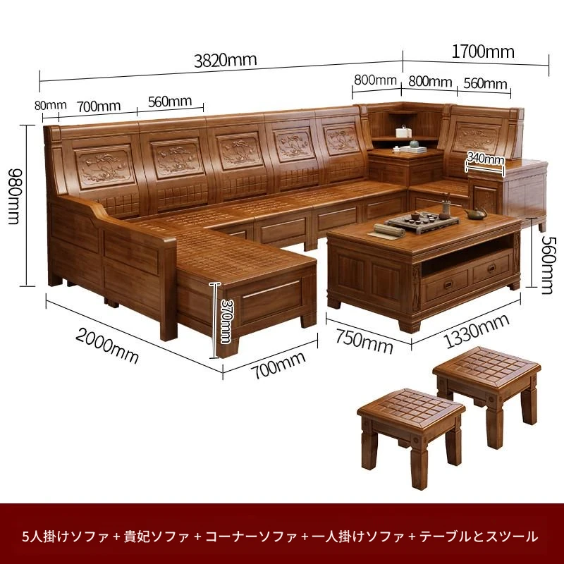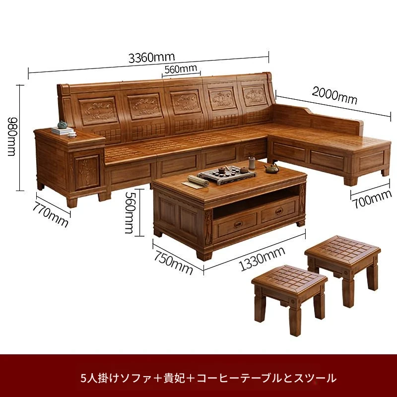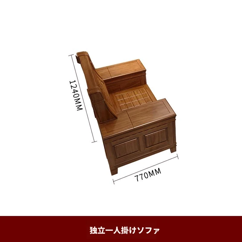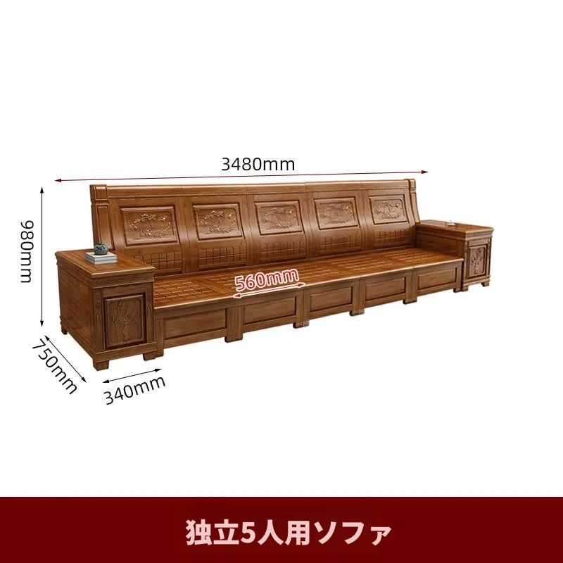 香樟木の全木製ソファセット - 中華風の彫刻デザイン、収納機能付きの角型ソファ。高品質な無垢材で、心地よい座り心地と優雅な雰囲気を実現。リビングにぴったりのエレガントなインテリア。