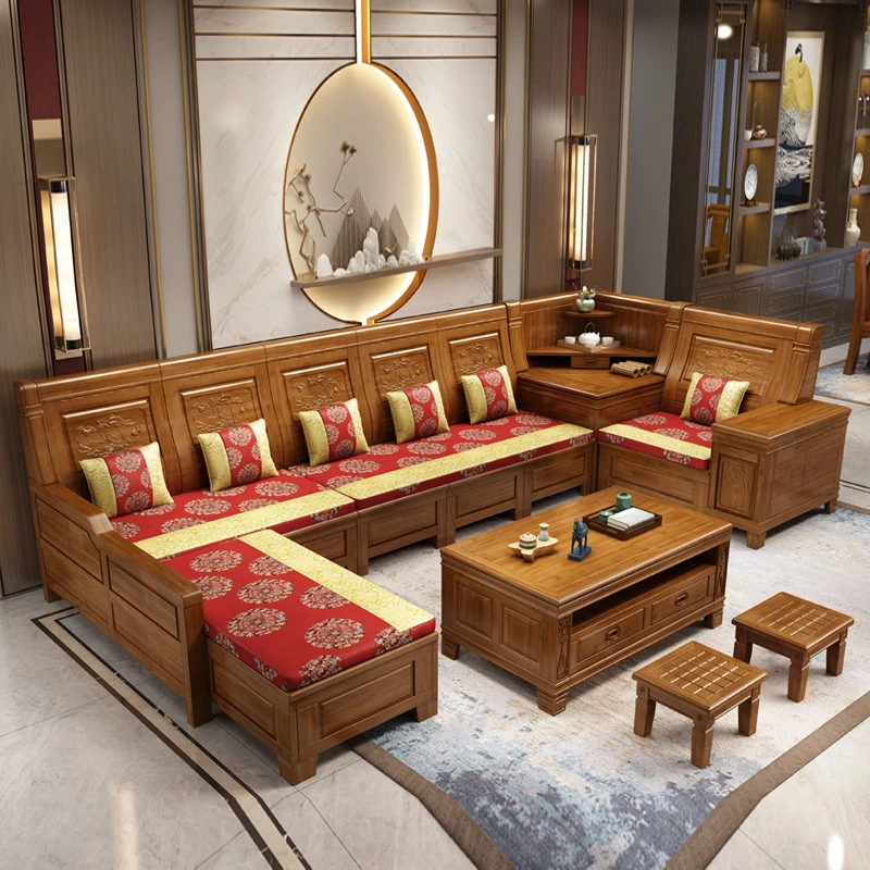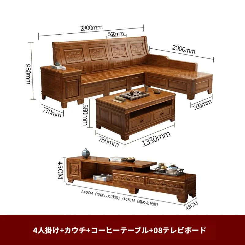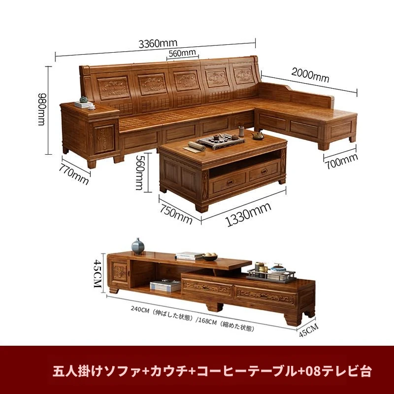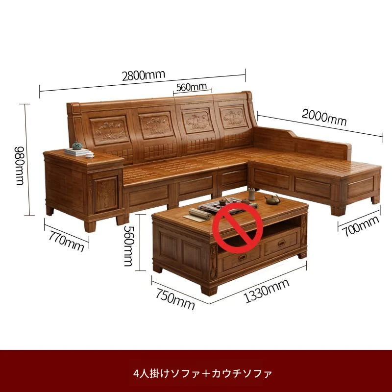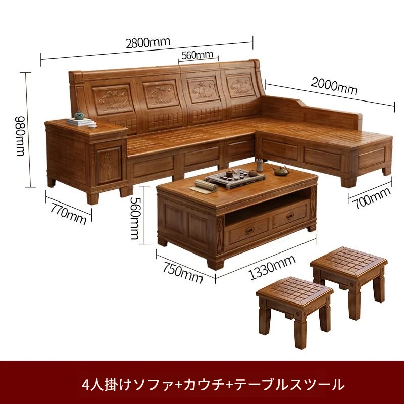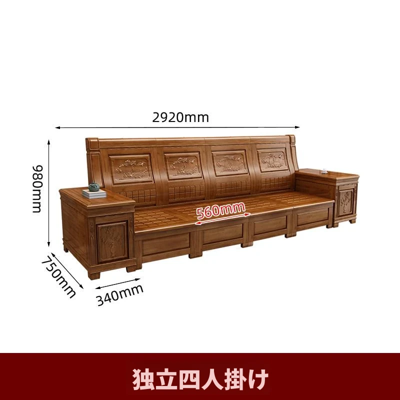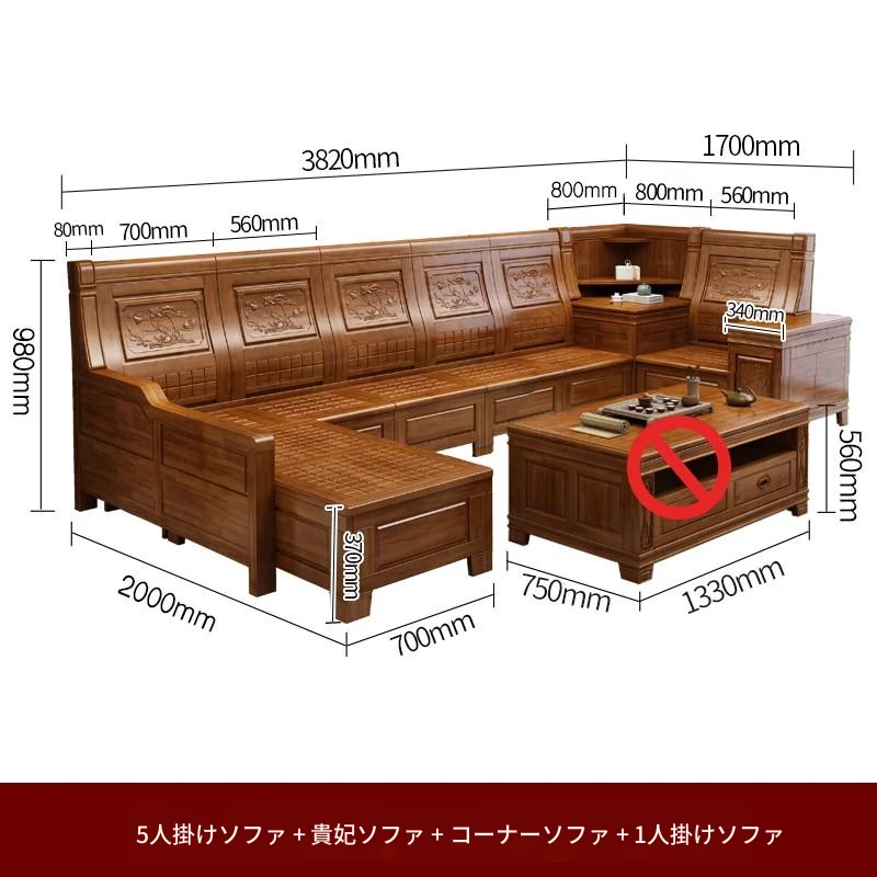 香樟木の全木製ソファセット - 中華風の彫刻デザイン、収納機能付きの角型ソファ。高品質な無垢材で、心地よい座り心地と優雅な雰囲気を実現。リビングにぴったりのエレガントなインテリア。