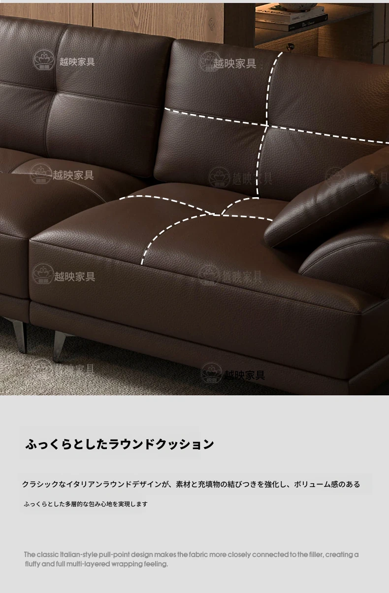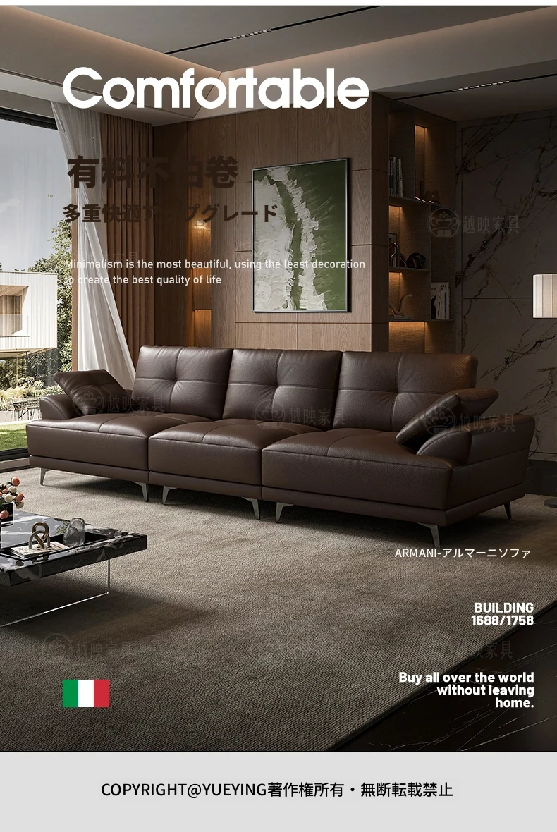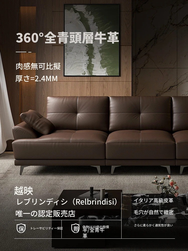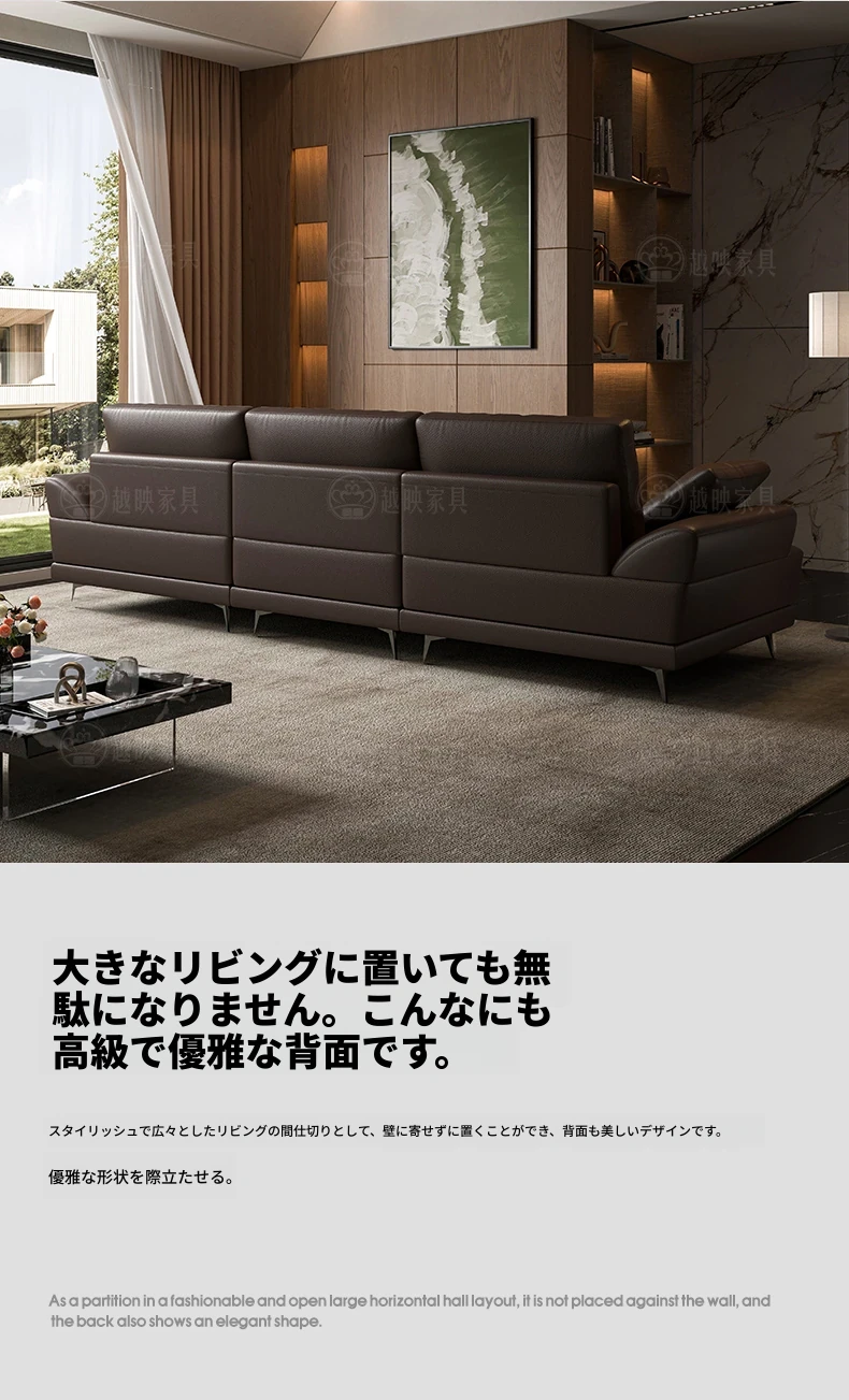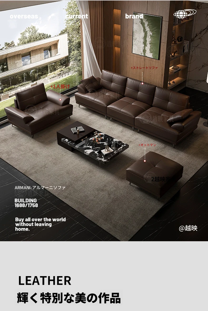 アマーニの本革ソファ、ミニマルデザインで高級感溢れるリビング向け。小型住宅に最適なファーストレザー使用、耐久性抜群でスタイリッシュな空間を演出。