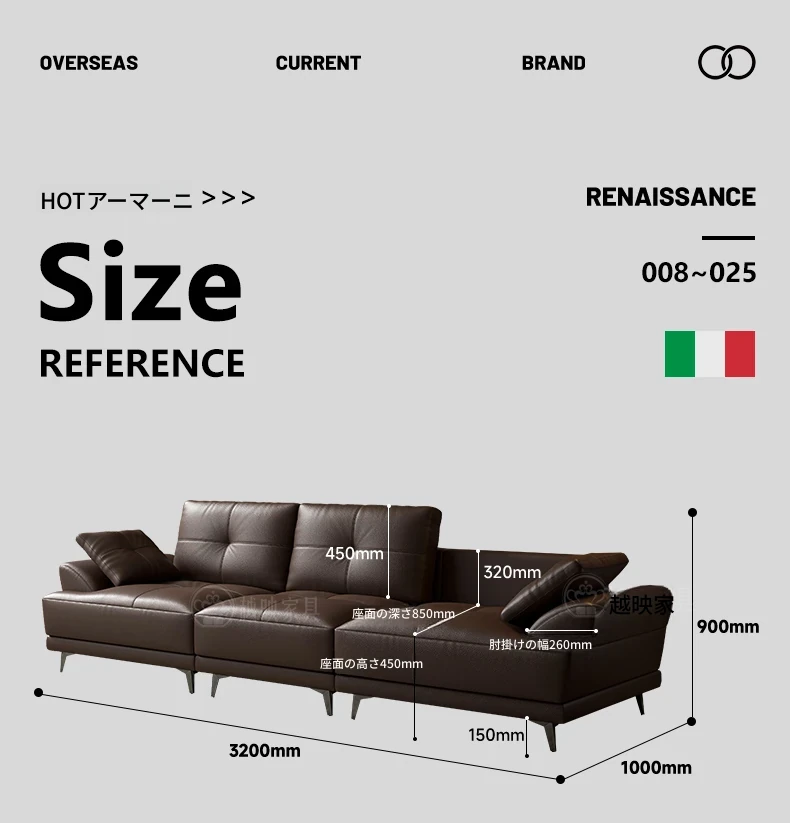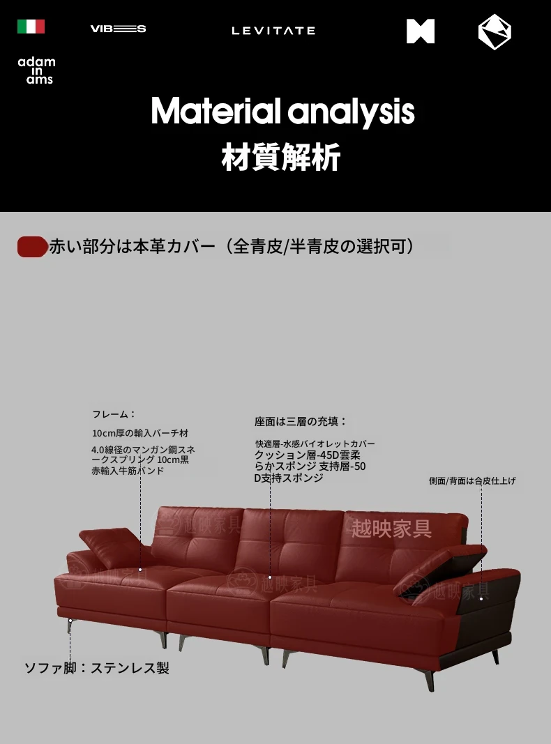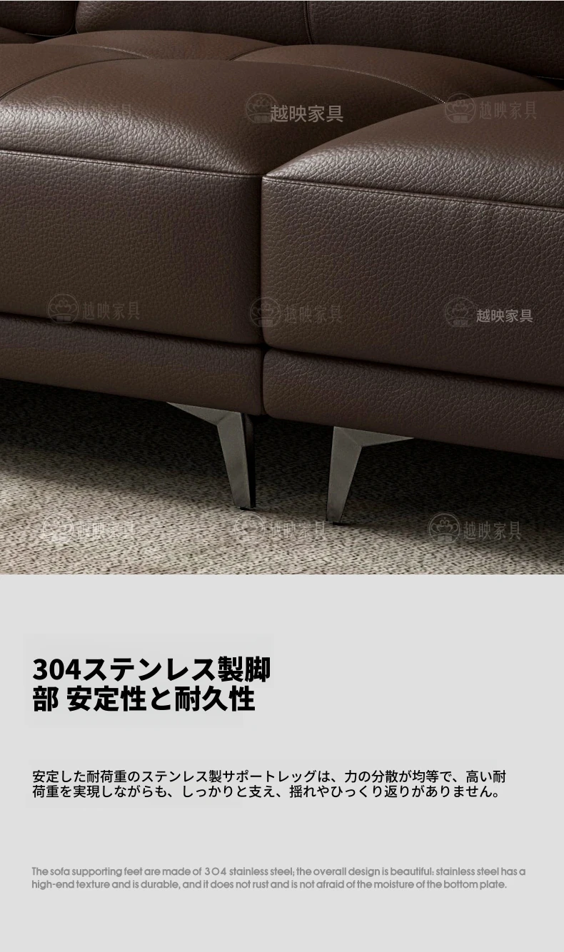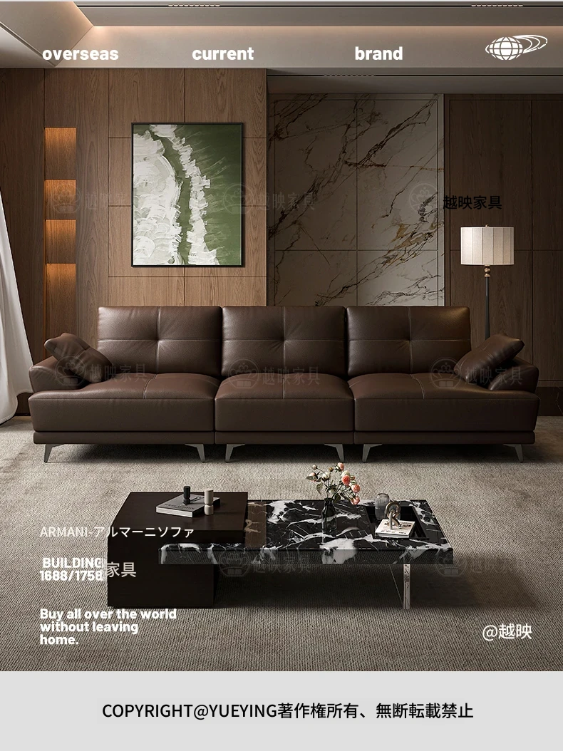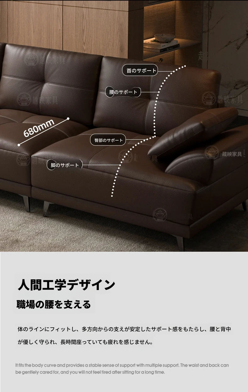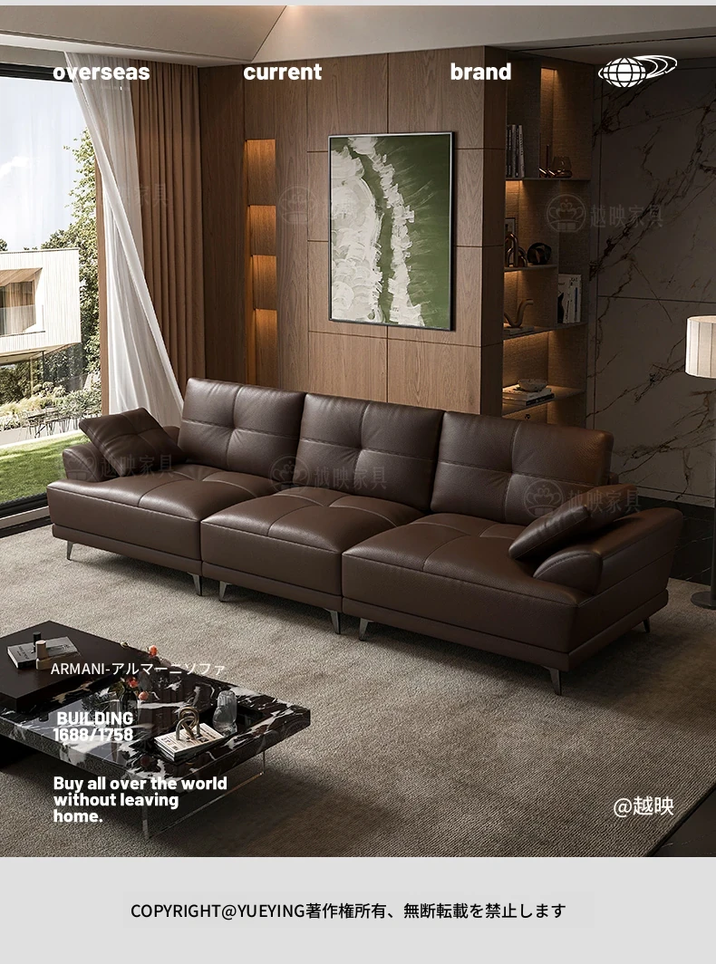 アマーニの本革ソファ、ミニマルデザインで高級感溢れるリビング向け。小型住宅に最適なファーストレザー使用、耐久性抜群でスタイリッシュな空間を演出。