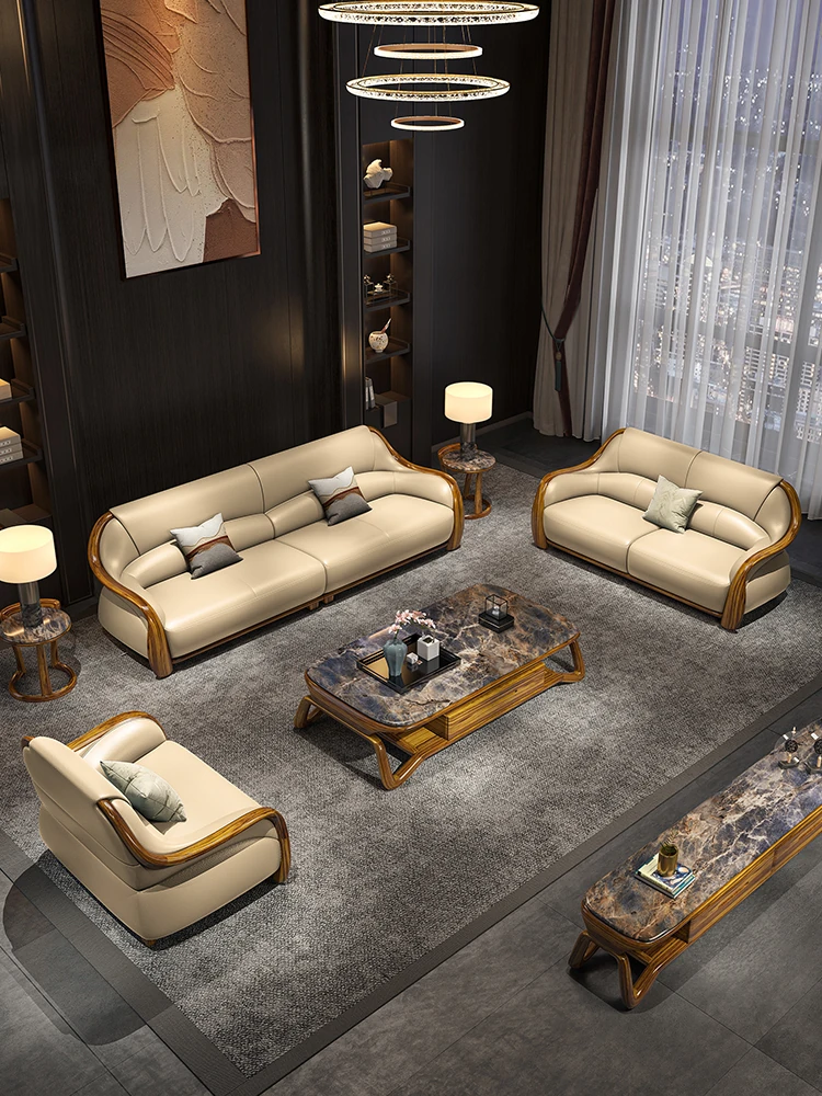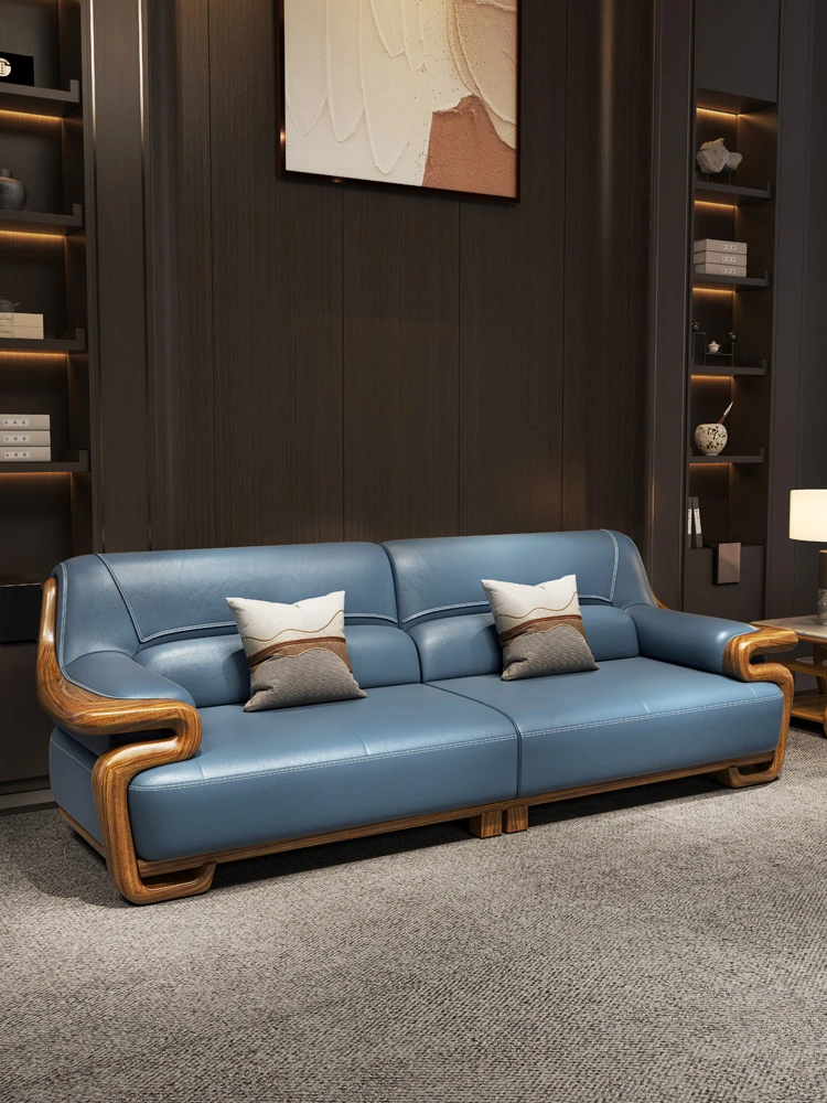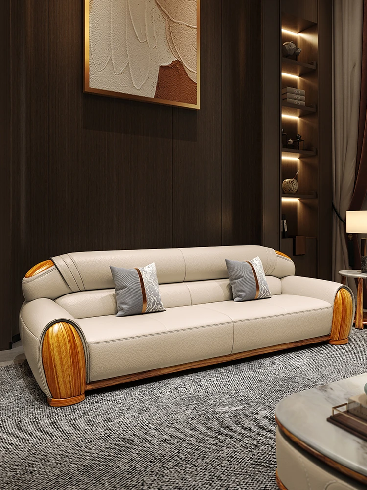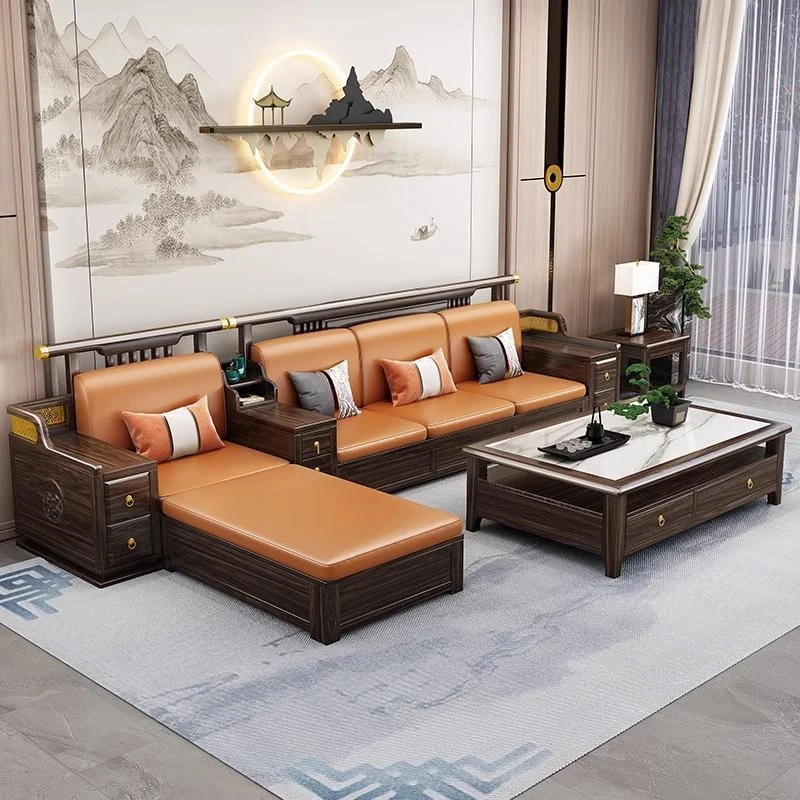 新中式ウッドウッド真皮ソファー|高級感あふれる別荘リビング向け|本格的な無垢材ソファーセット|広東省仏山の家具で、上質な空間を演出!