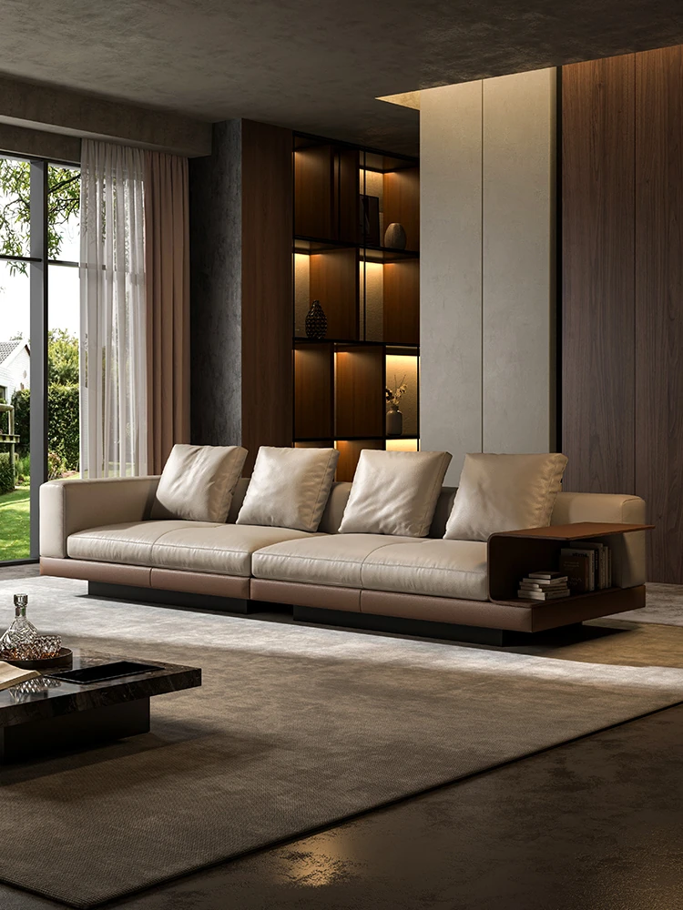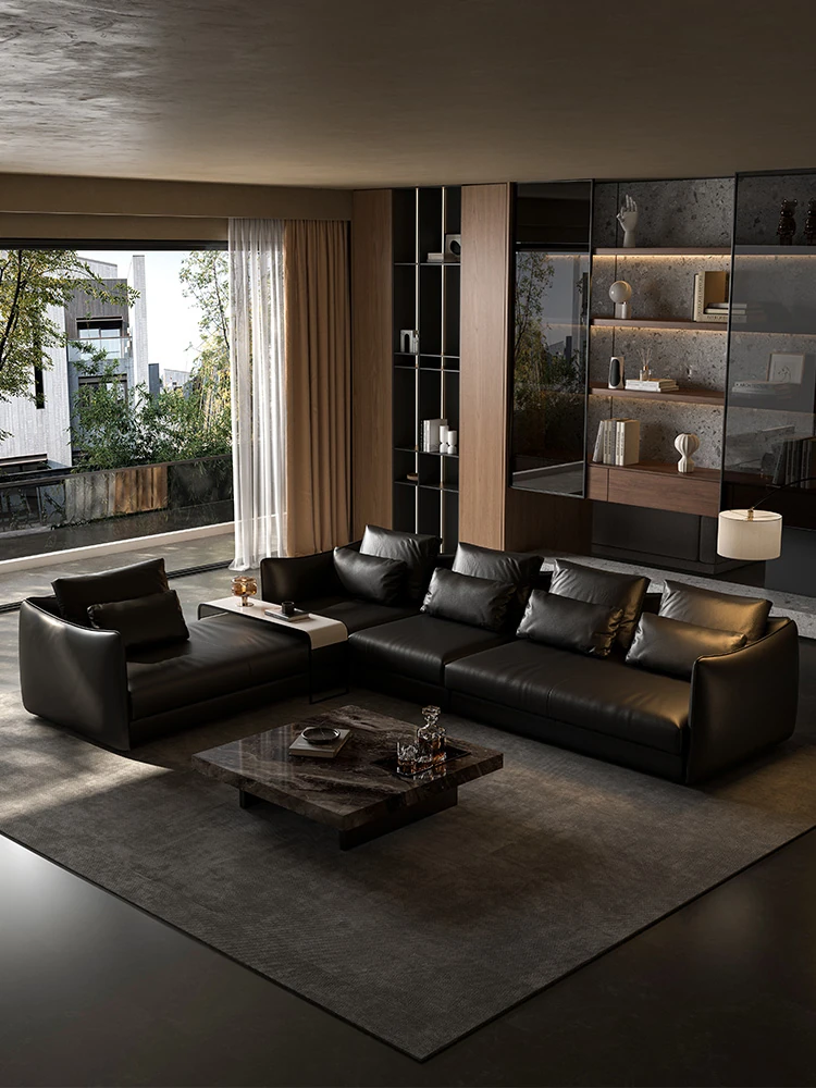 エレガントなチャンネル本革ソファー - イタリアンスタイルのリビングルーム用、輸入全青皮、大平層ヴィラにぴったりな現代的なシンプルデザイン。おしゃれで快適な空間を実現!