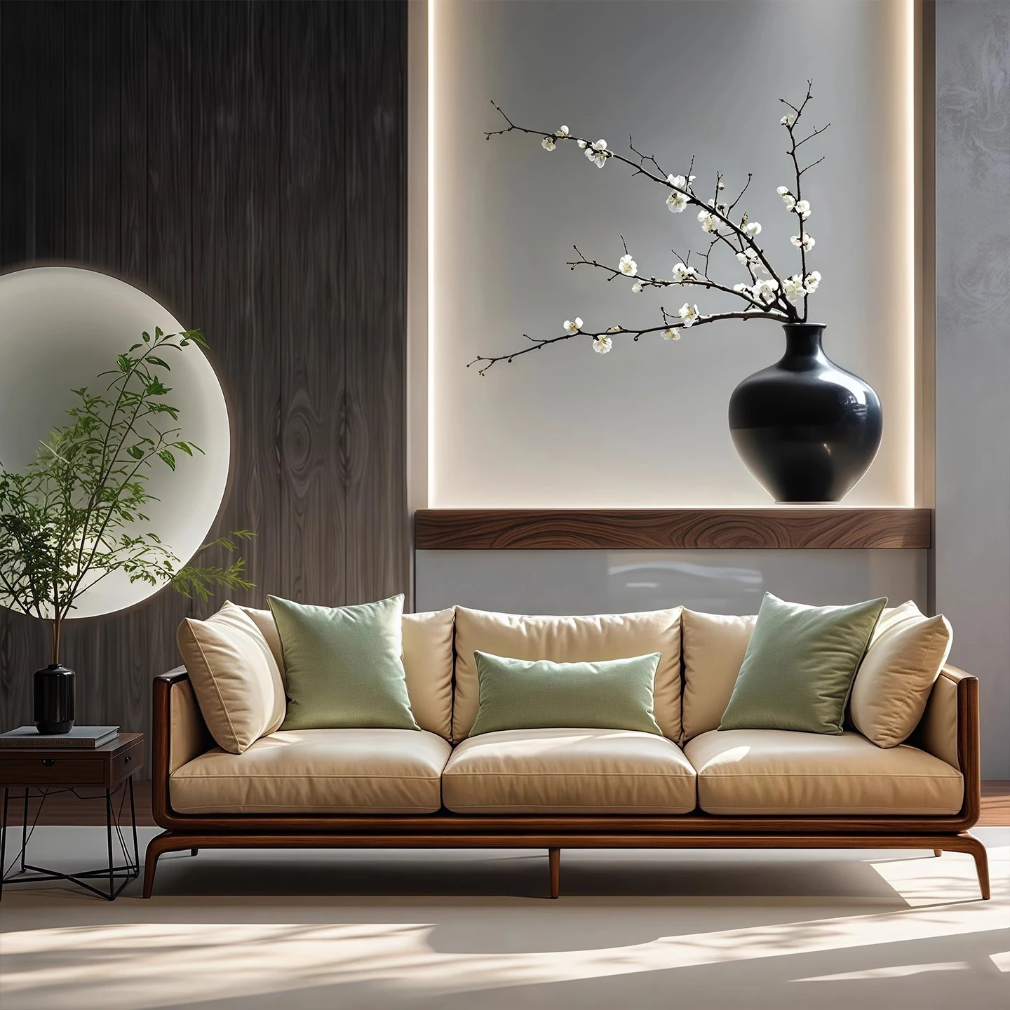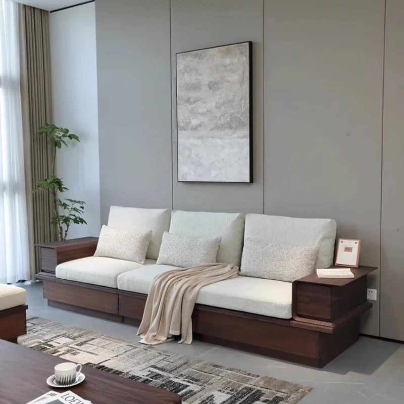 新中式現代ミニマリスト風ソファ - ウォールナット材使用、冬夏兼用!収納付きで小型リビングに最適なデザイン。快適な空間を演出し、スタイリッシュなインテリアを実現!