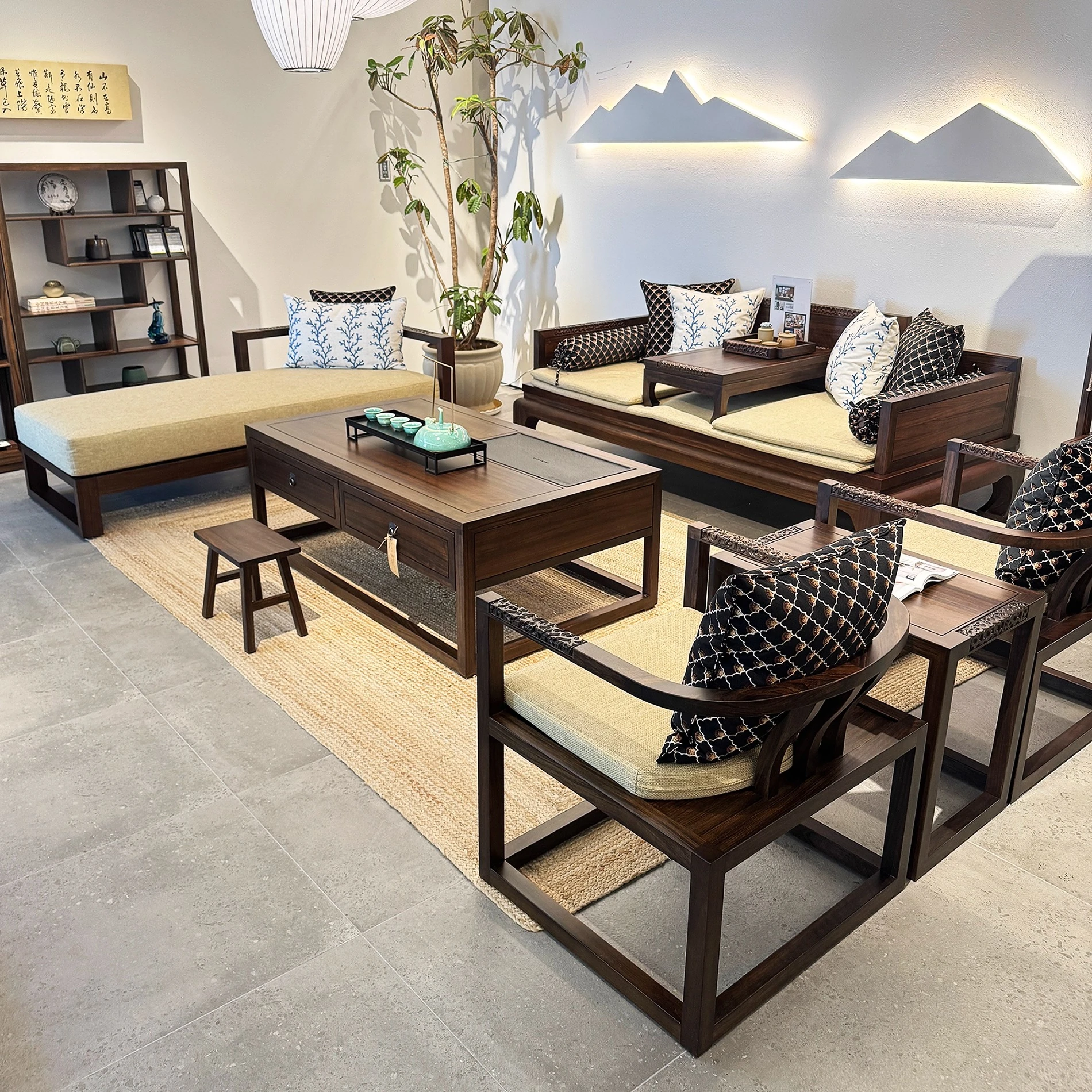 新中式禅風デザインの北米産ブラックウォールナット無垢材ソファセット - 宋代美学を取り入れたリラックス空間を演出!あなたの居住空間に美しさと静けさをもたらします。