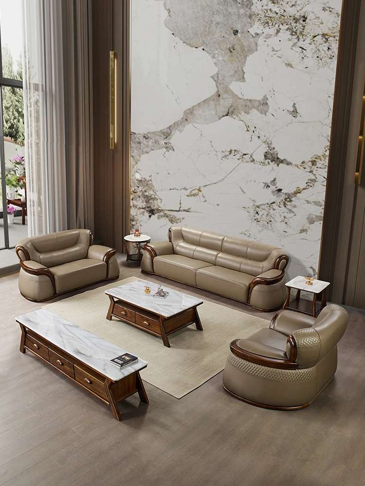 モダンウッ金木・牛革本革ソファ - ラグジュアリーな別荘リビングに最適な新中式ミニマリズムデザイン。佛山工場直送の高品質家具で、洗練された空間を演出します。